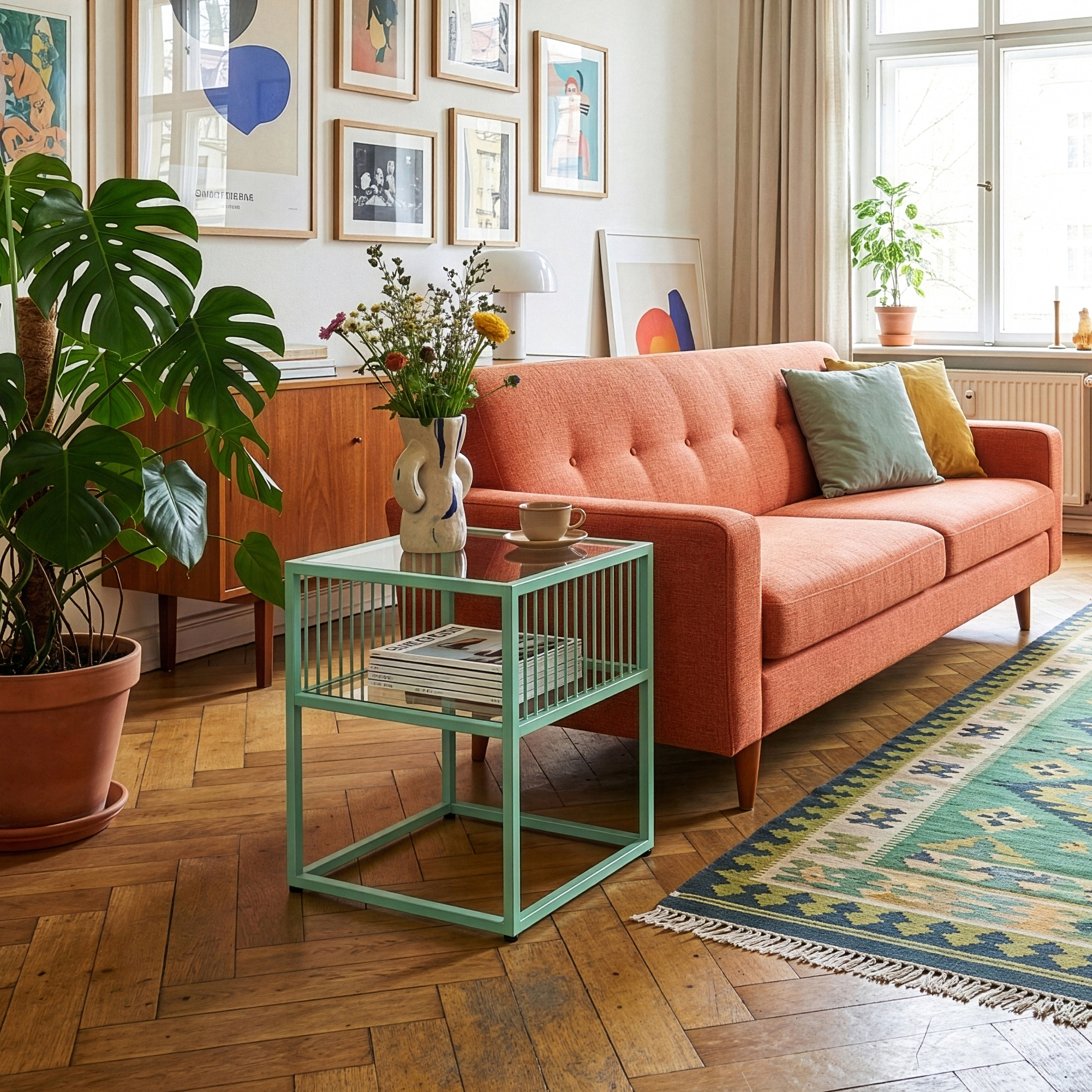 Această masă laterală cu blat din sticlă este alegerea ideală pentru un decor modern, aerisit și practic. Cu un design elegant în nuanță verde mentă, se integrează ușor în living, dormitor, hol sau birou și oferă un plus de stil oricărui spațiu.