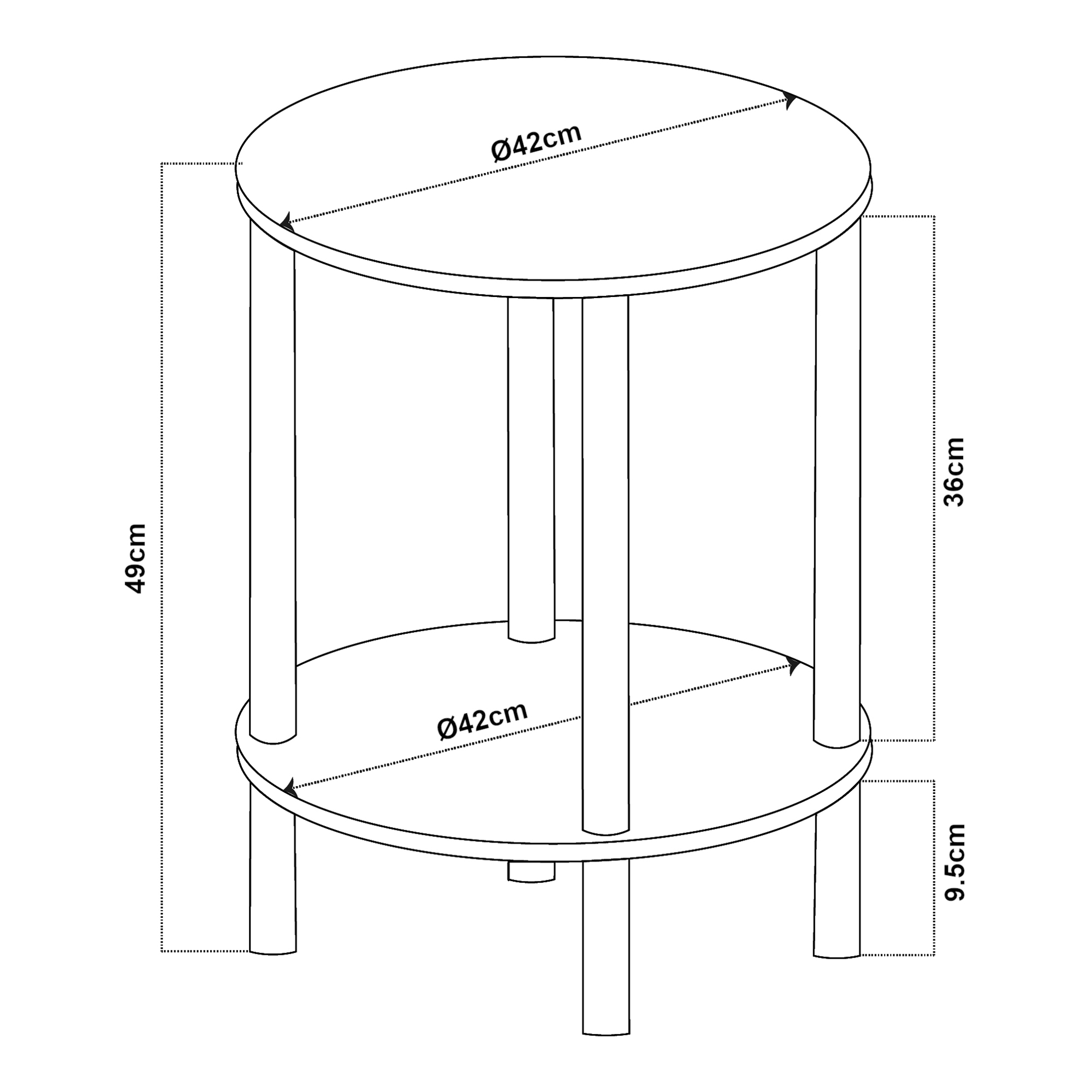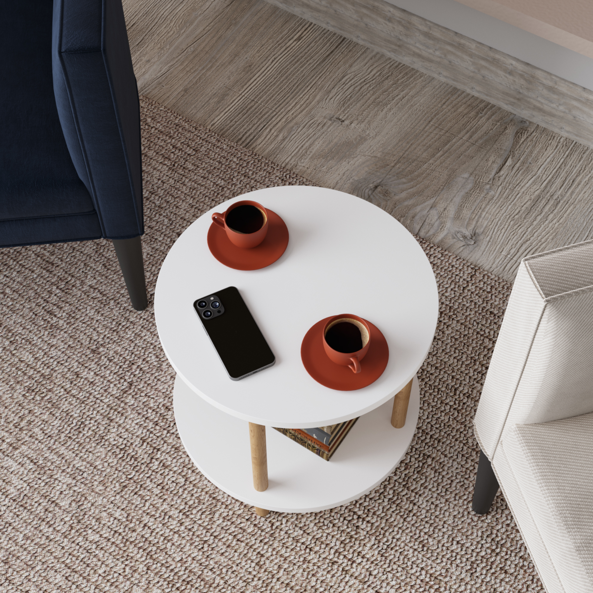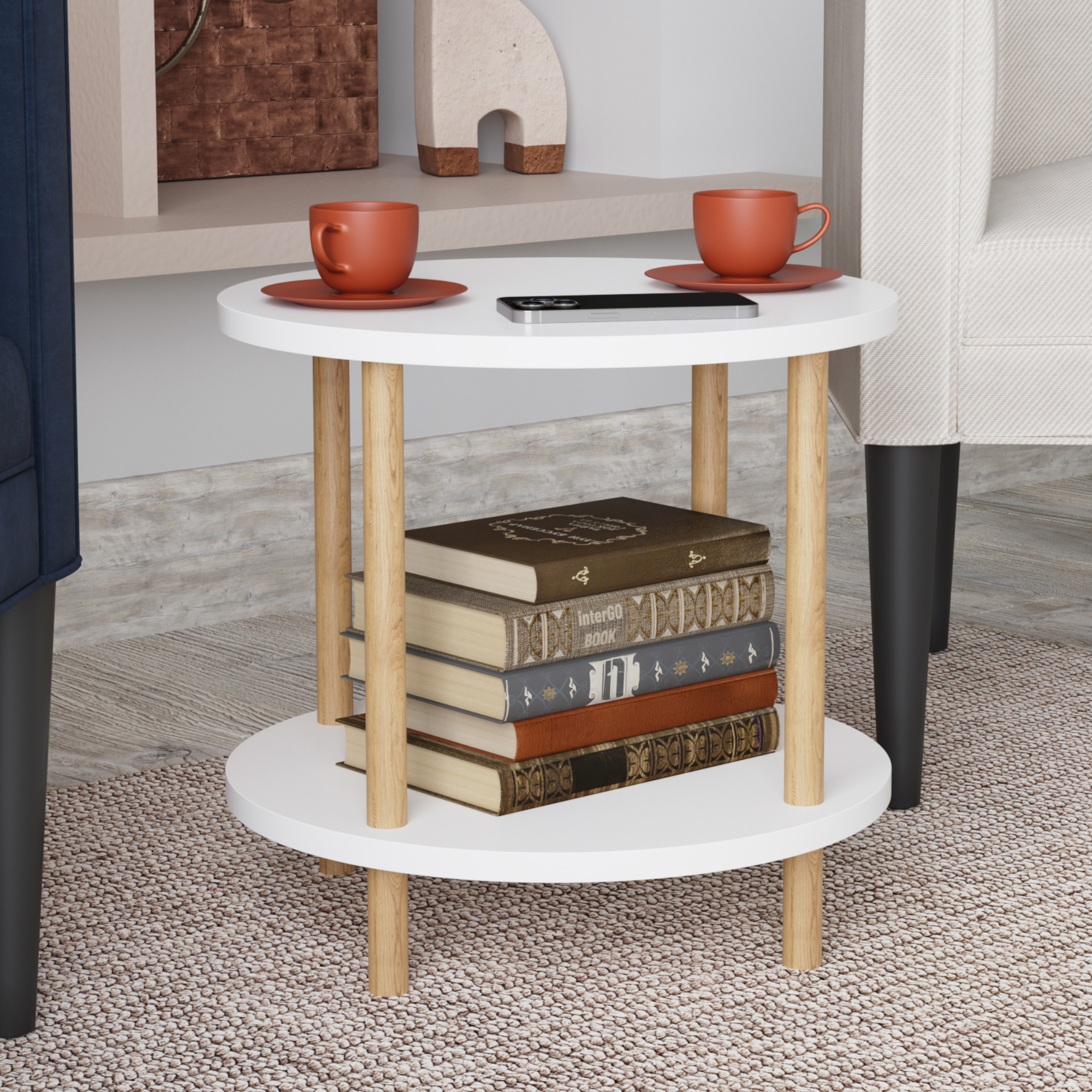 Blatul superior și polița inferioară oferă spațiu suficient pentru obiectele pe care vrei să le ai la îndemână. O poți folosi ca măsuță de cafea lângă canapea, ca noptieră pentru veioză și cartea preferată sau ca suport pentru decorațiuni, vaze, lumânări ori rame foto. Designul rotund și combinația dintre alb și aspectul de lemn creează un efect vizual plăcut și prietenos.