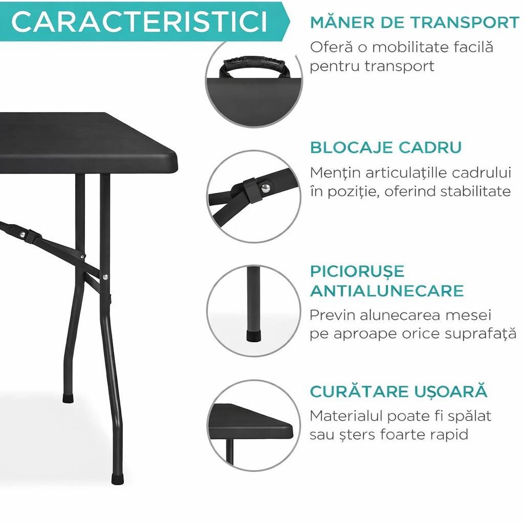 Blatul realizat din HDPE este durabil, ușor de curățat și rezistent la condiții meteo variate, iar cadrul metalic asigură stabilitate bună în utilizare. Pentru un plus de siguranță, masa este prevăzută cu sistem de blocare la deschidere și capete antiderapante la picioare.