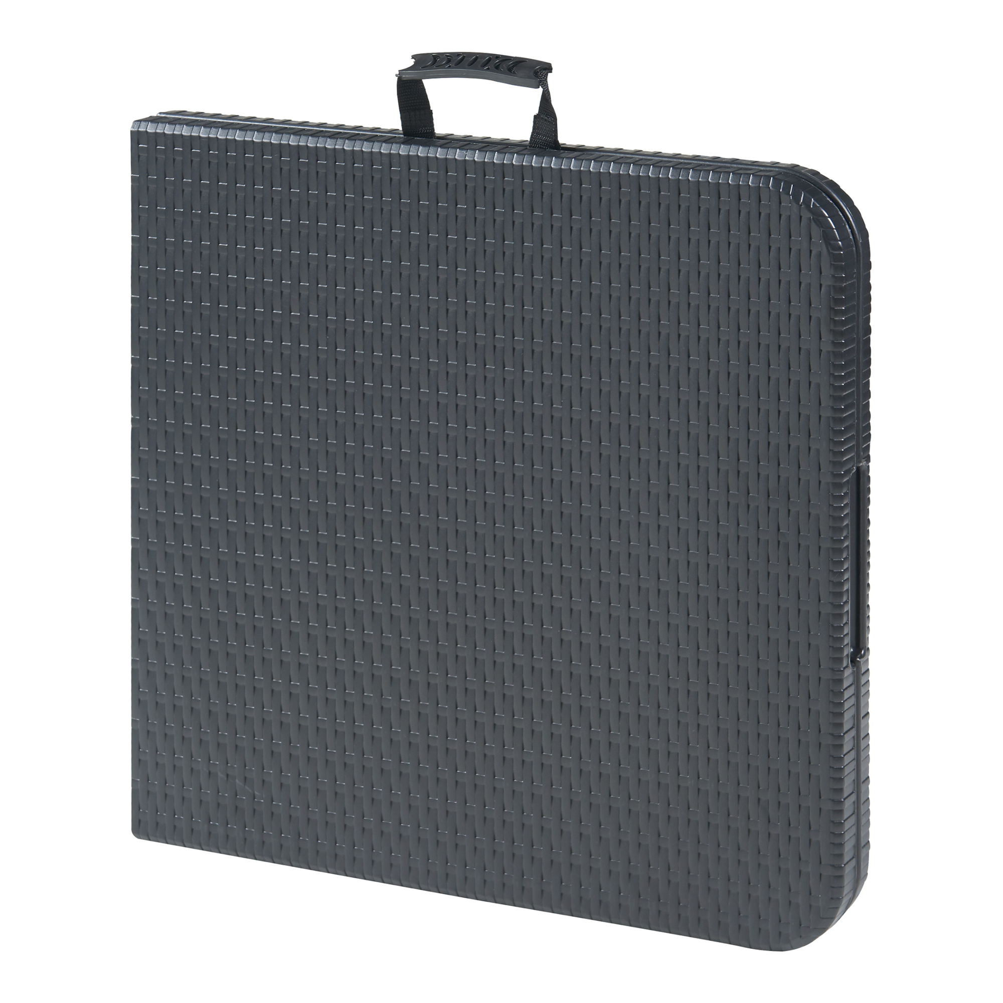 Datorită funcției de pliere, masa se montează și se strânge rapid, iar mânerul de transport integrat o face ușor de mutat oriunde ai nevoie. Blatul cu aspect rattan în culoare neagră adaugă un plus de stil, fiind potrivit atât pentru utilizări practice, cât și pentru un decor exterior plăcut.