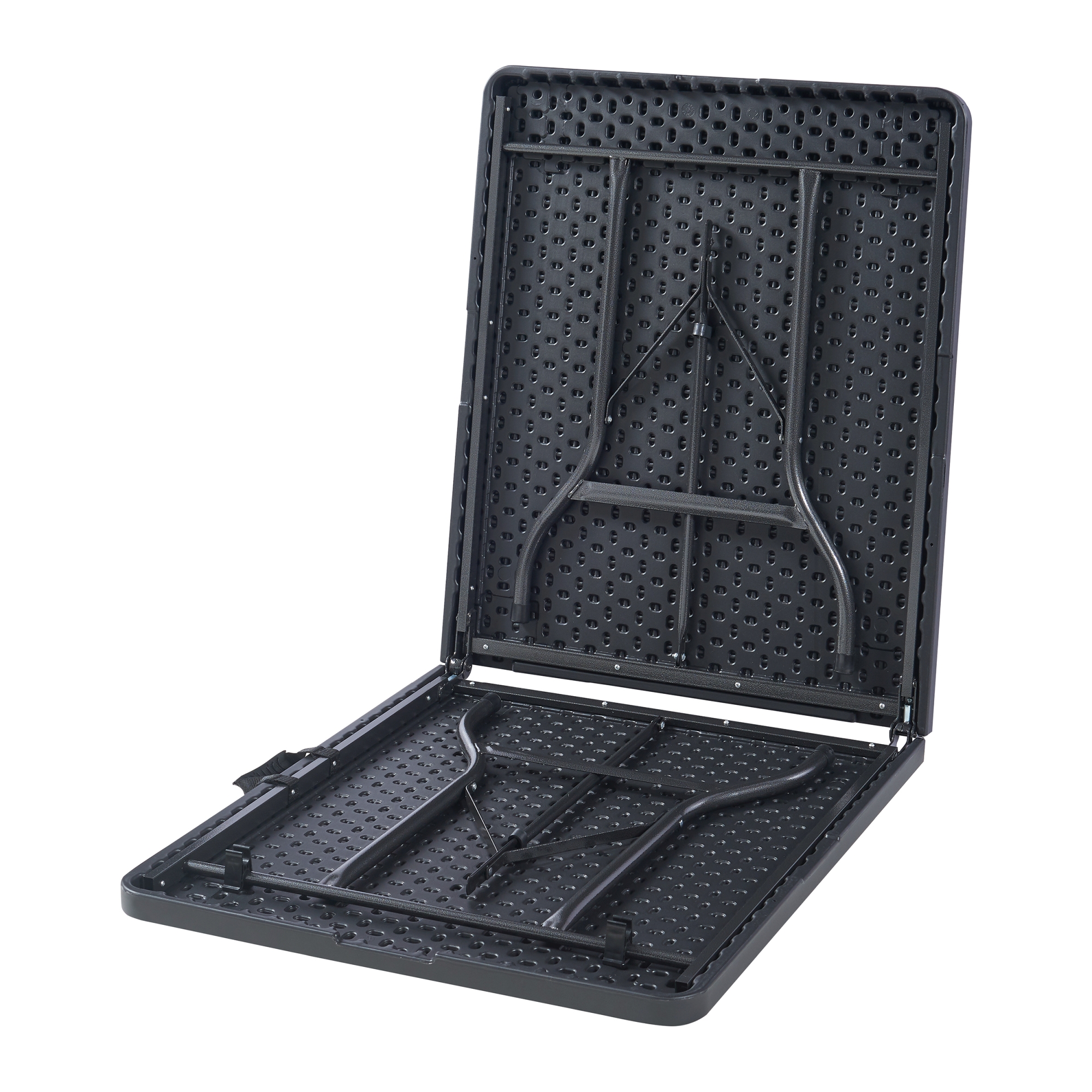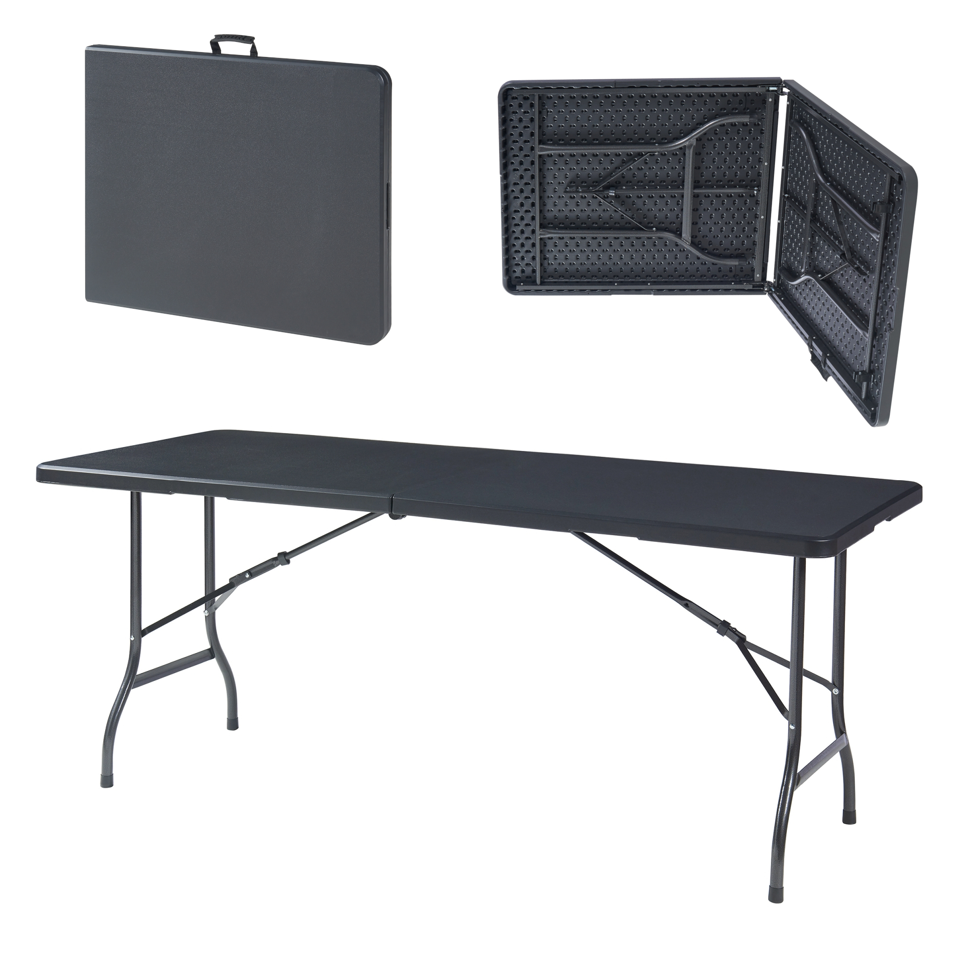 Cadrul metalic robust asigură stabilitate bună inclusiv pe suprafețe mai puțin uniforme, iar blatul din HDPE este ușor de întreținut și simplu de curățat cu o lavetă umedă. Designul dreptunghiular și culoarea neagră o fac potrivită pentru utilizări multiple, atât acasă, cât și în deplasare.