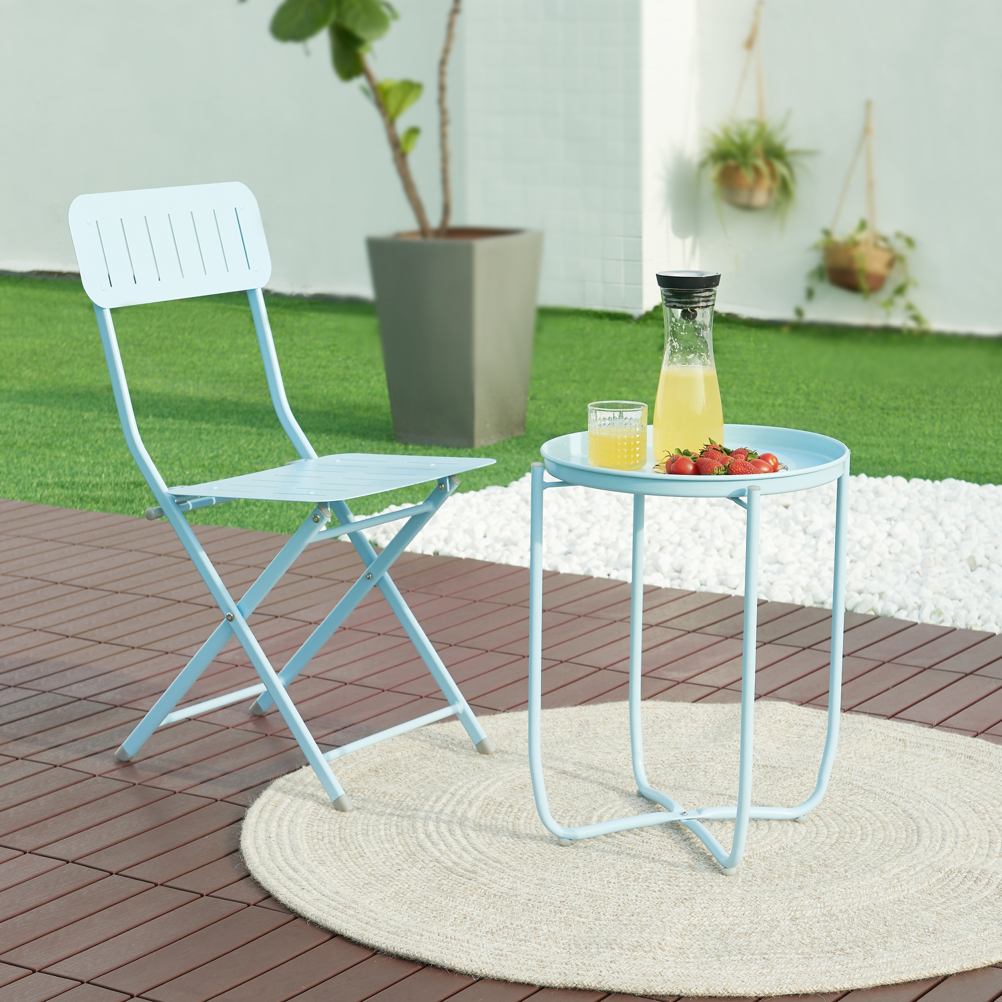 Masă tip tavă Sandefjord – alegerea practică și elegantă pentru momentele de relaxare din casă sau din aer liber. Cu un design modern, finisaj în nuanță albastru deschis și structură rezistentă din oțel vopsit electrostatic, această măsuță de exterior este ideală pentru băuturi, gustări, deserturi sau obiectele pe care vrei să le ai la îndemână.