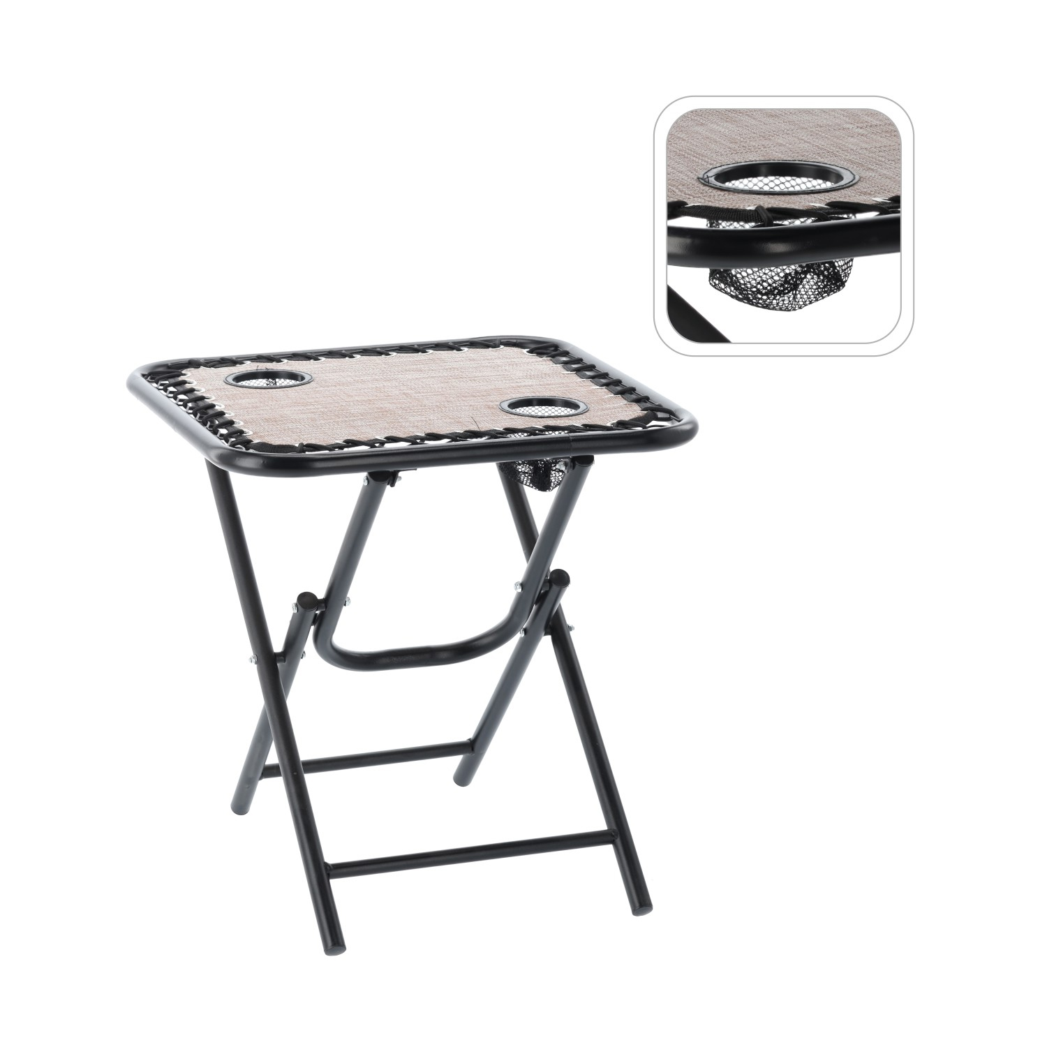 Designul pliabil o face ușor de depozitat și transportat, iar blatul textil tensionat oferă o suprafață utilă pentru băuturi, gustări sau accesorii mici. Este o alegere inspirată pentru cei care caută o masă camping pliabilă rezistentă, practică și simplu de folosit.