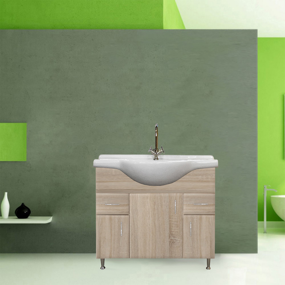 Mască chiuvetă baie Leziter Bianca Plus 85 cu lavoar ceramic, stejar Sonoma