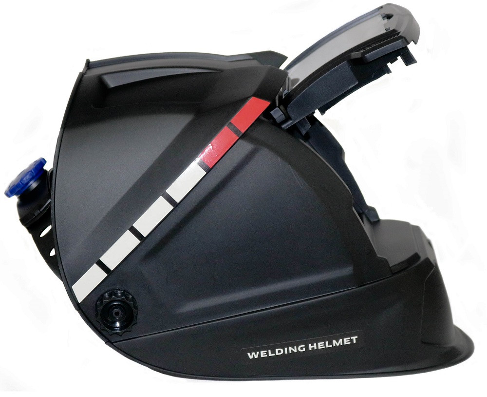 Modelul este prevazut cu filtru adiactinic DIN 11 si cu geam rabatabil pentru polizare, ceea ce o face practica atat la sudare, cat si in operatiuni de slefuire sau la utilizarea altor scule electrice. Sticla transparenta ofera protectie suplimentara atunci cand viziera este ridicata.