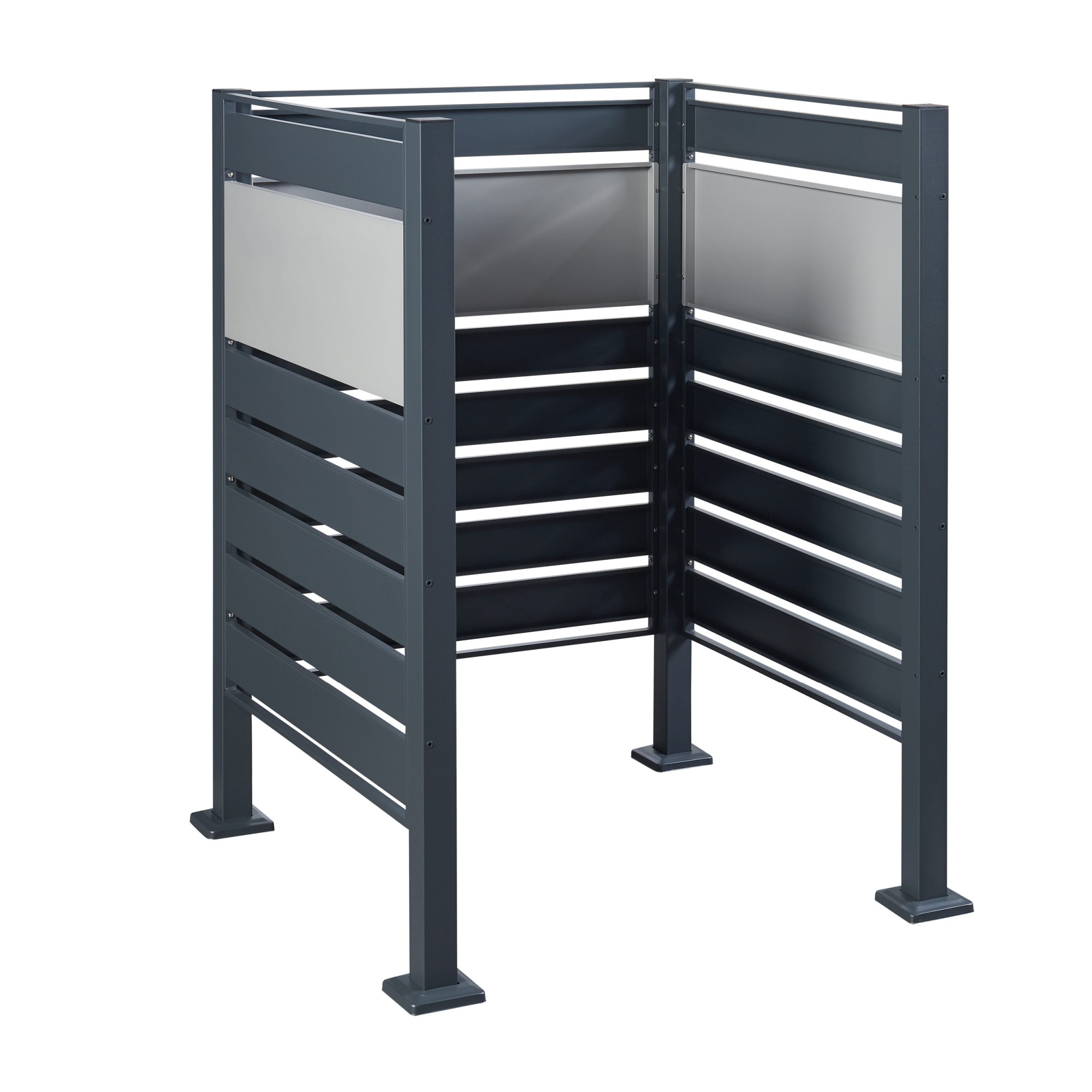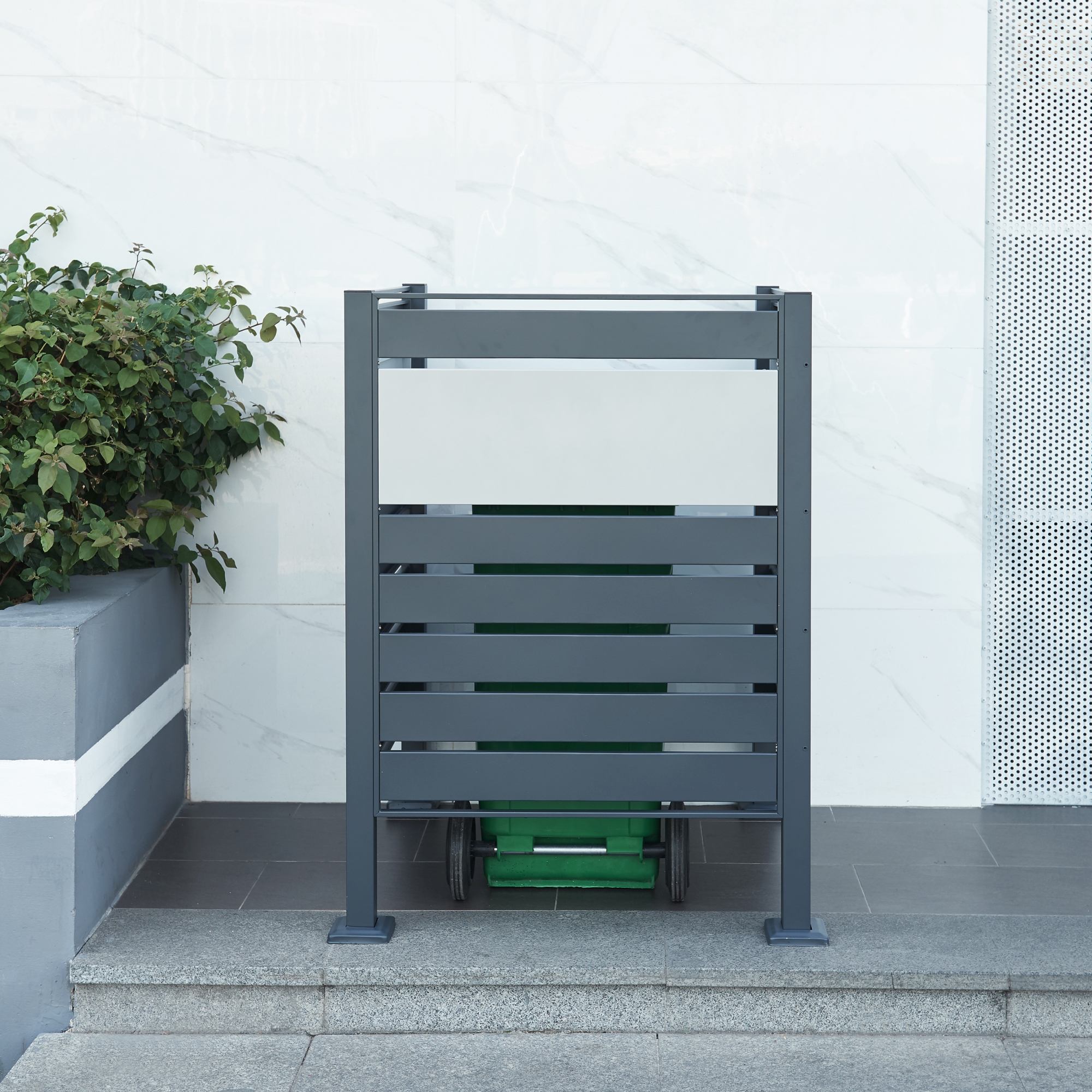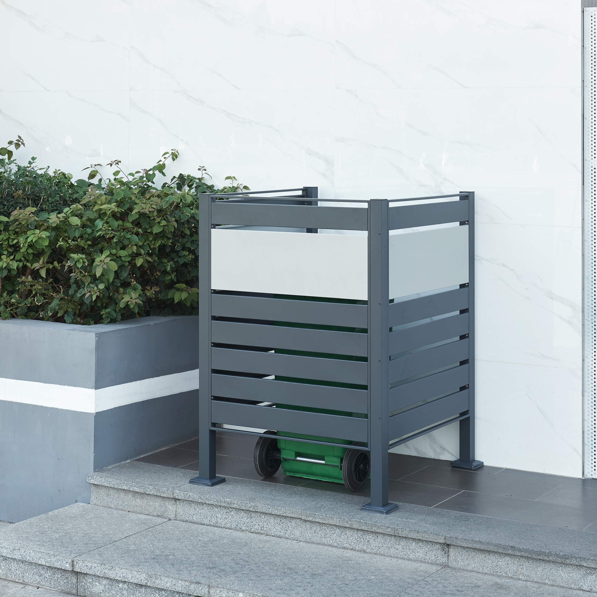 Masca pentru pubela Uusikaupunki este o solutie practica si eleganta pentru a ascunde recipientele de gunoi si pentru a imbunatati aspectul zonei exterioare. Designul modern in nuante de antracit si argintiu se integreaza usor langa casa, garaj, terasa sau spatii comerciale, oferind un plus de ordine si estetica.