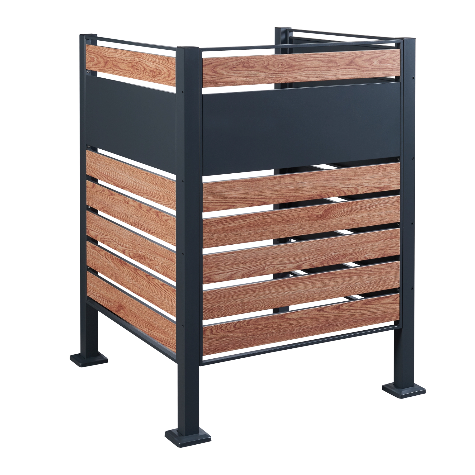Masca pentru tomberon Uusikaupunki este o solutie practica si eleganta pentru a ascunde recipientele de gunoi si pentru a imbunatati aspectul curtii, gradinii sau al spatiului din fata casei. Designul modern, in nuanta antracit cu aspect de lemn, ofera un plus de stil fara sa compromita functionalitatea.