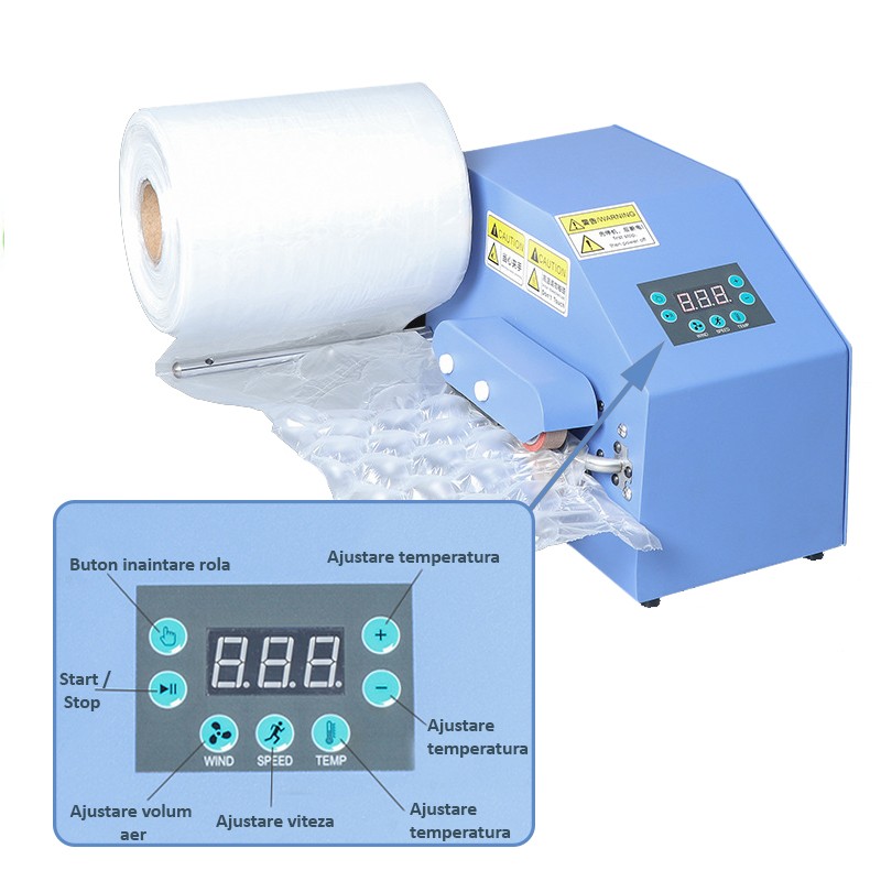 Masina care produce folie cu bule de aer este o alegere rentabila pentru depozite, magazine si fabrici mici intrucat este un dispozitiv eficient, usor de manevrat si compact, cu o greutate de aproximativ 6 kg.
