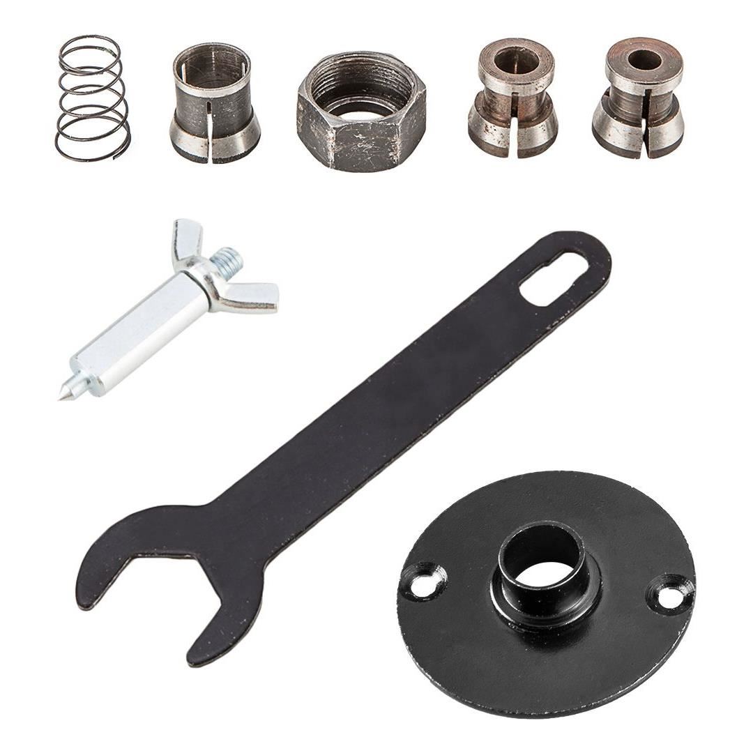 - setul cu masina de frezat include: o cheie plata, o bucsa de ghidare pentru copiere dupa un sablon, un varf pentru frezat in cerc, adaptor pentru aspirarea prafului cu reducere, trei bucse cu diametre de 6, 8, 12 mm, un ghidaj paralel din aluminiu echipat cu un capac special din plastic pentru a proteja impotriva zgarieturilor si un mecanism care permite reglarea precisa a pozitiei taietorului in raport cu materialul margine.