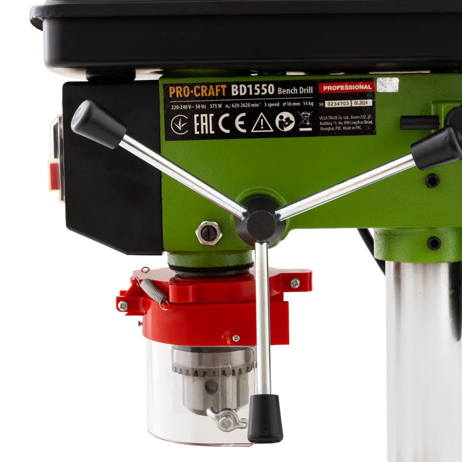 Masina de gaurit cu coloana Procraft BD1550Masina de gaurit cu coloana Procraft BD1550 este un model de mare putere cu cel mai mic gabarit din gama masinilor de gaurit stationare din marca Procraft. Dimensiunea modesta va permite sa instalati masina in garaj, atelier sau acasa. Proiectat pentru foraj in metal, lemn, plastic, precum si in alte materiale de constructie. Procraft BD1550 are 5 viteze, rotatiile sunt reglate in intervalul de la 580 la 2650 rpm prin repozitionarea curelei de transmisie. Deci, ca sa clarificam, cuplajul este pe curele, NU pe roti dintate.In fata mandrinei este montata o masca transparenta din plastic, functia sa fiind de a proteja impotriva aschiilor de lemn sau metal care se desprind de materialul prelucrat in timpul lucrului. Mandrina cu trei bacuri fixeaza burghiul cu diametru de pana la 16 mm si are o distanta de miscare verticala de 50 mm. Platforma de sprijin(menghina) poate fi rotita in unghi (pana la 45 de grade) si reglata in inaltime. Pentru fixarea menghinei, sunt prevazute suruburi speciale, care se fixeaza in canelurile de pe suportul metalic. Lungimea de deschidere a menghinei este de max 55mm.Modelul se remarca prin prezenta unui motor puternic de 375 W, cu greutate redusa si calitate buna. Pentru a oferi o stabilitate mai mare si a reduce vibratiile, masina poate fi fixata pe masa de lucru folosind gaurile de pe talpa. Masina de gaurit cu coloana Procraft BD1550 este o alegere excelenta, complet echipata pentru o munca confortabila cu bani putini.*CUREAUA DE TRANSMISIE - INCLUSA