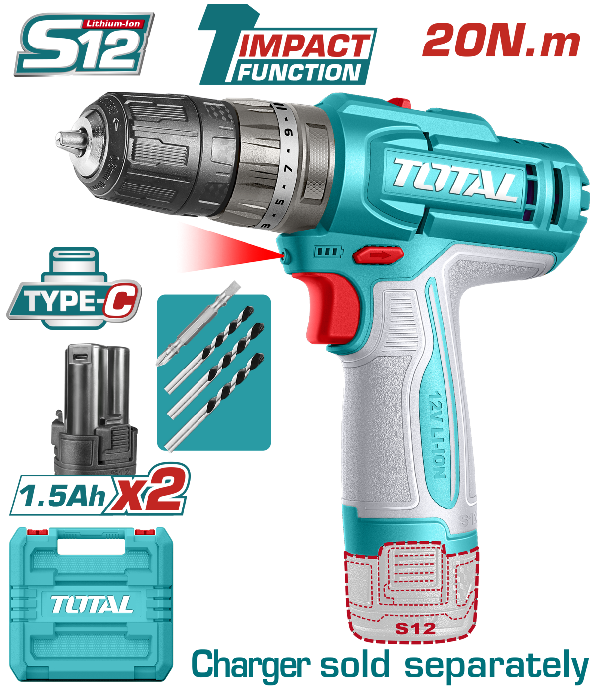 Mașină de găurit cu percuție TOTAL 12V, 2x1.5Ah, 20 Nm, USB-C (fără încărcător)