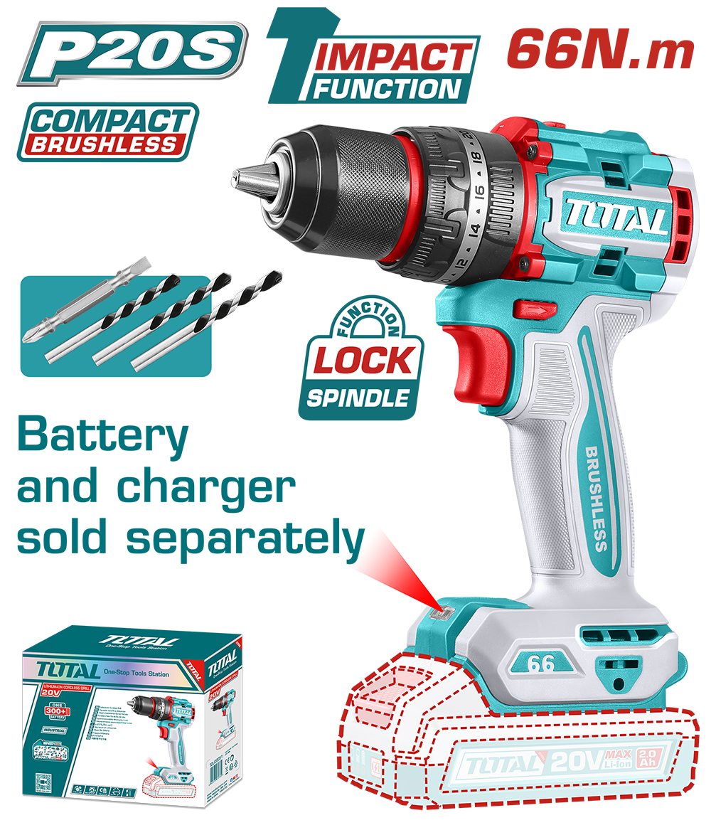 Mașină de găurit cu percuție TOTAL 20V, 66 Nm, motor brushless, fără acumulator