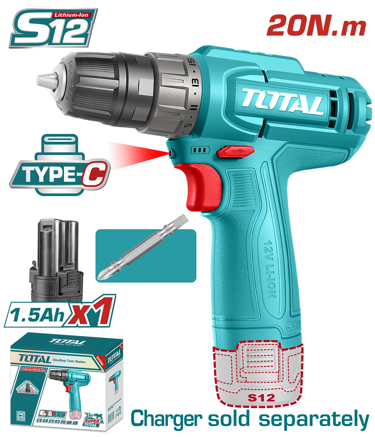 Mașină de găurit și înșurubat cu acumulator TOTAL 12V, 1.5Ah, LED, Li-Ion