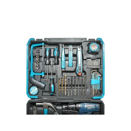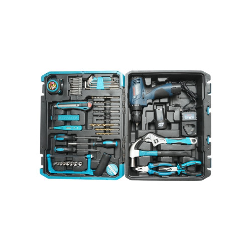 - Ciocan, patent, cheie reglabila, fierastrau de mana, surubelnite, ruleta, cutter, imbus, burghiu, banda izolatoare, biti, tester tensiune, masina de insurubat si gaurit cu 2 acumulatori