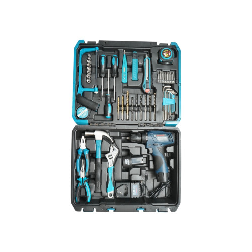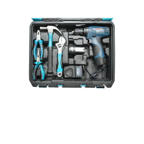 - Ciocan, patent, cheie reglabila, fierastrau de mana, surubelnite, ruleta, cutter, imbus, burghiu, banda izolatoare, biti, tester tensiune, masina de insurubat si gaurit cu 2 acumulatori