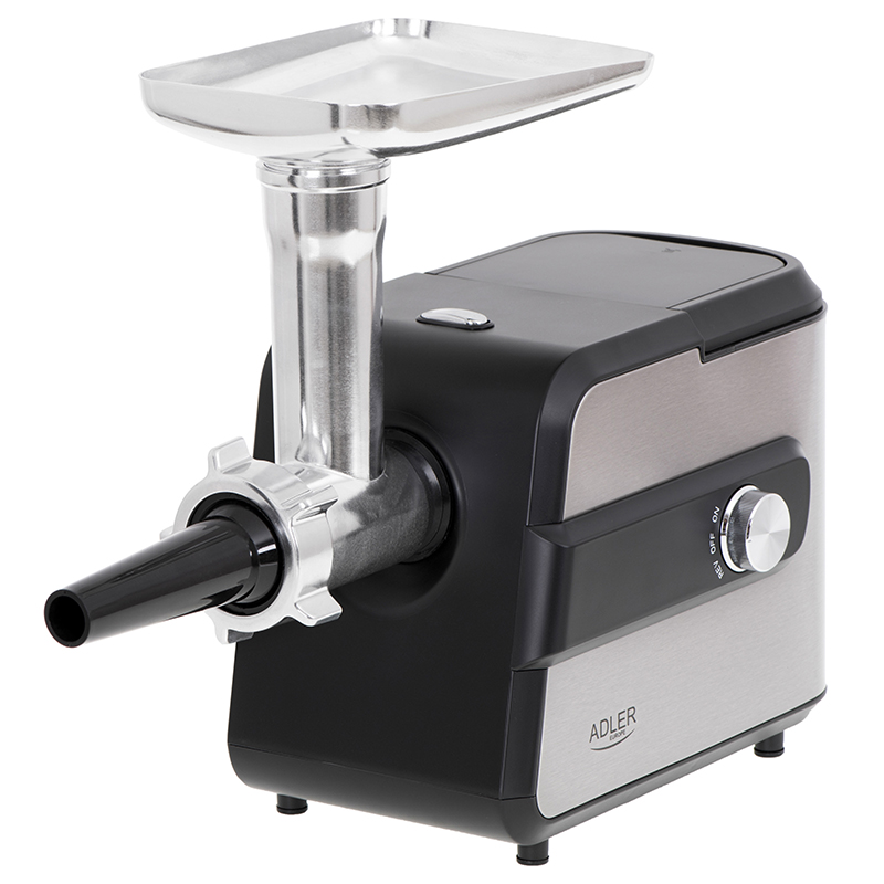 Masina de tocat electrica Adler AD 4813 este un aparat care este un ajutor real in bucatarie. Este echipata cu 3 site interschimbabile din inox cu diametrul gaurii de 3 mm, 5 mm, 7 mm si un taietor de legume cu trei lame.