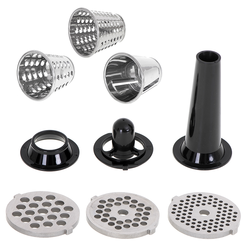 3 site din inox: sita de 3 mm - plasa fina pentru macinare la o consistenta destul de compacta, uniforma, perfect pentru umplutura si pateu; sita de 5 mm - ochiuri medii pentru tocat carnea pentru burgeri, chiftele si umpluturi diverse (galuste, clatite si tortilla), puteti macina si legume, branza tare si chiar nuci; sita de 7 mm - plasa groasa pentru tocat carnea cu structura distincta, scurta este destinata producerii de carnati;