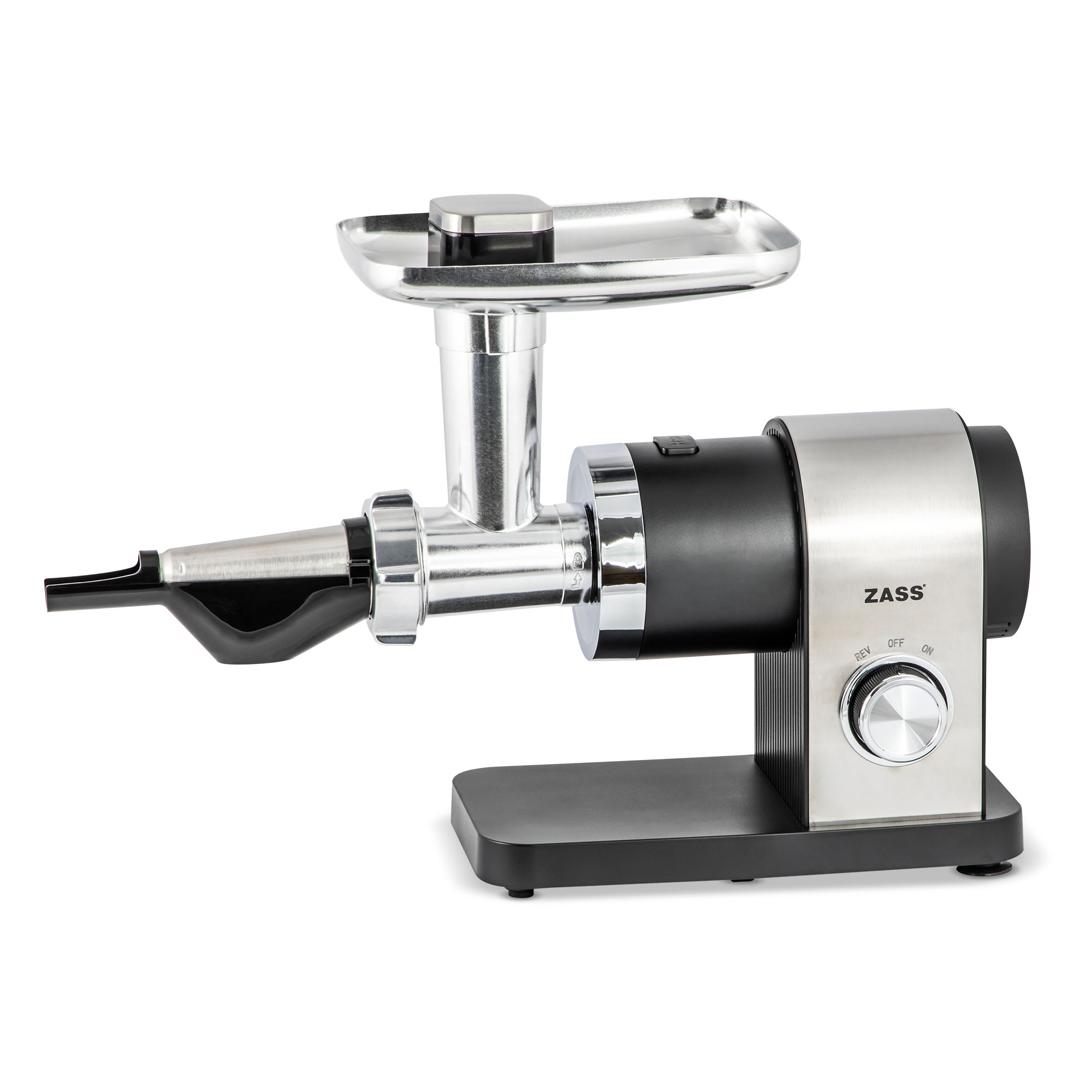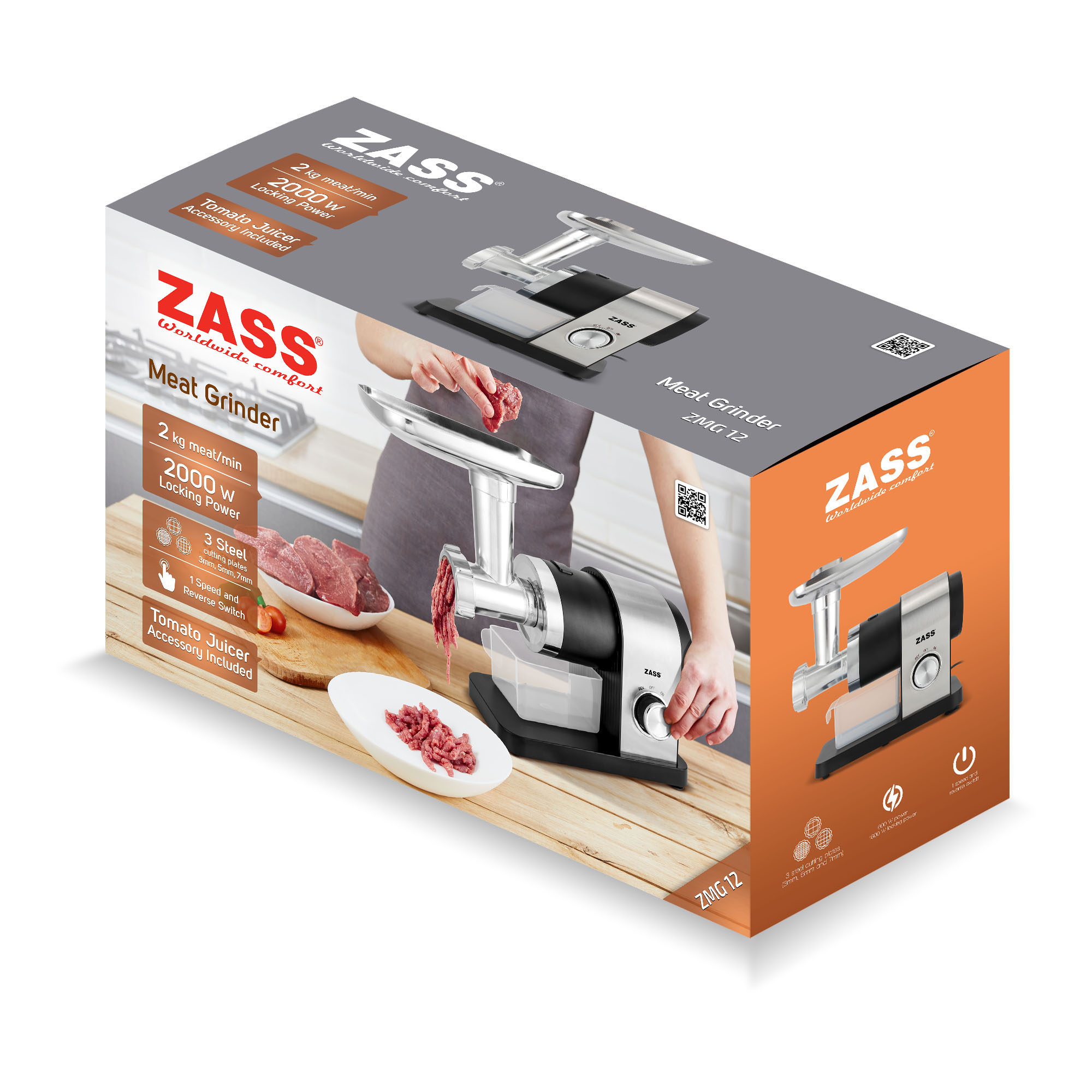 Masina de tocat carne Zass ZMG 12 este alegerea potrivita pentru cei care vor sa pregateasca rapid carne tocata proaspata, carnati de casa sau suc de rosii. Cu o putere maxima de 1800 W, capacitate de aproximativ 1,8 kg/min si accesorii utile incluse, acest model ofera eficienta, versatilitate si utilizare usoara in orice bucatarie.
