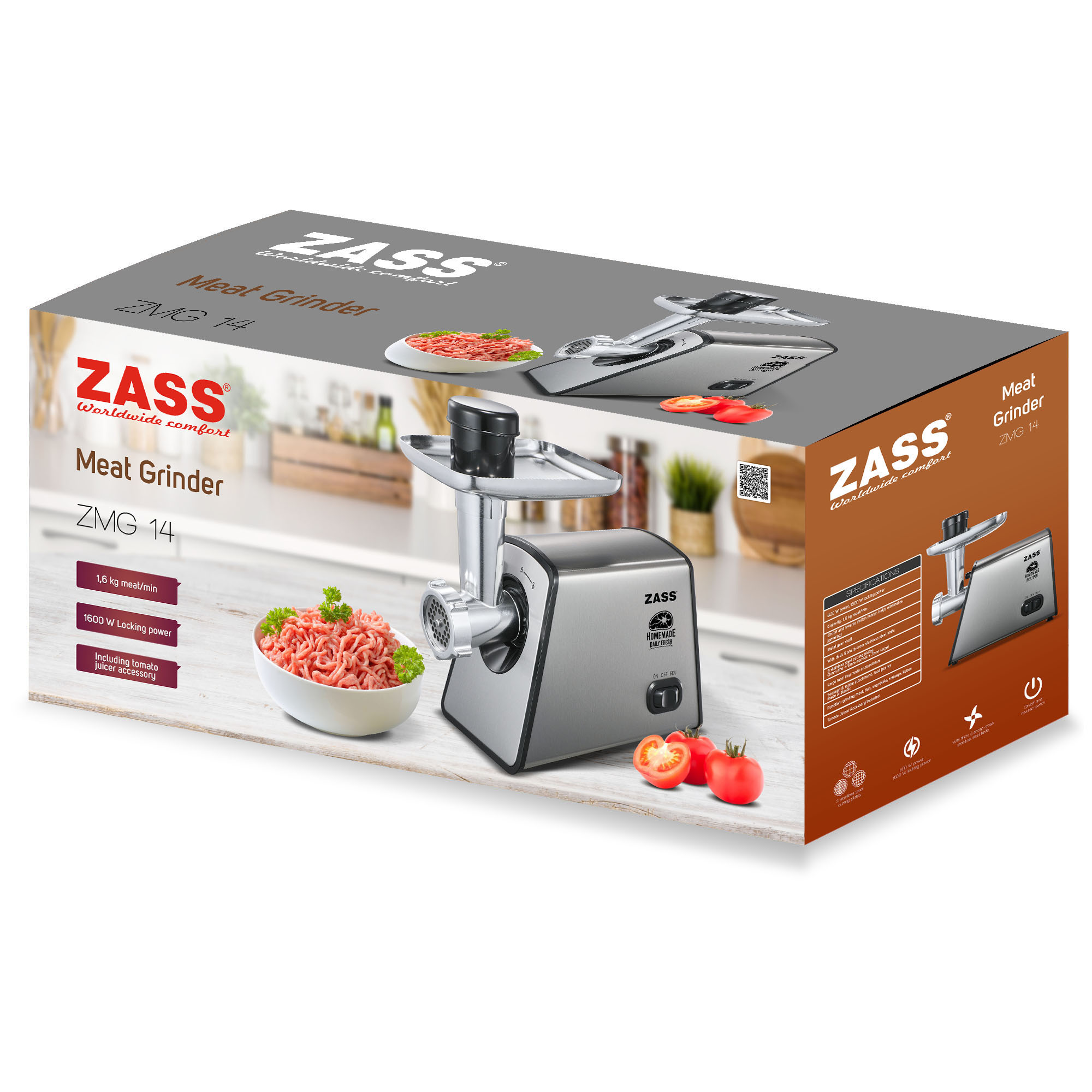 Mașina de tocat carne ZASS ZMG 14 este alegerea potrivită pentru cei care vor preparate proaspete, făcute acasă, rapid și ușor. Cu o putere maximă de 1600 W, carcasă elegantă din oțel inoxidabil și o capacitate de tocare de aproximativ 1,6 kg/minut, acest model te ajută să pregătești carne tocată, pește, legume, cârnați, kebbe sau chiar suc de roșii, fără efort.