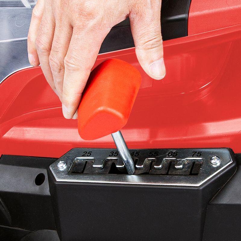 - Pune la dispozitie doua moduri de viteza: 2900 rpm si 3300 rpm. De asemenea, ofera 6 pozitii de taiere de la 25 la 75 mm care va permit sa alegeti inaltimea optima de cosire.