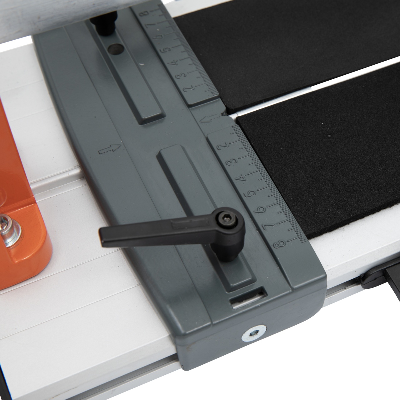 Utilizare: seteaza opritorii laterali cu gradaj milimetric, fixeaza placa, realizeaza trasarea cu rola/lama, apoi executa ruperea controlata pentru o taietura dreapta sau la unghi, in functie de setare.