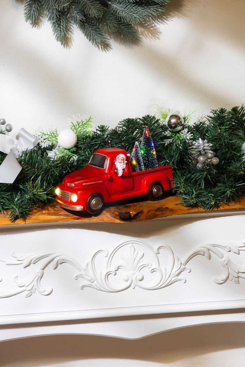 Modelul impresionează prin aspectul său vintage, cu camionetă roșie, brăduți în spate și Moș Crăciun la volan. Funcția de iluminare simplă și combinația de culori alb, verde, galben, albastru și roșu transformă această decorațiune luminoasă de Crăciun într-un accent vizual plăcut pentru orice amenajare sezonieră.