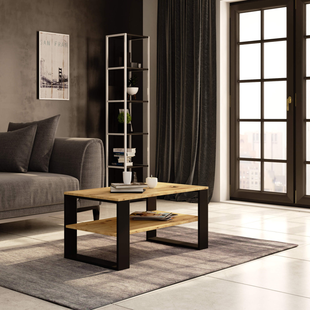 Masuta cafea ALEX cu raft inferior, PAL laminat, 92x53x45 cm, stejar artisan si negru Household NewTrend