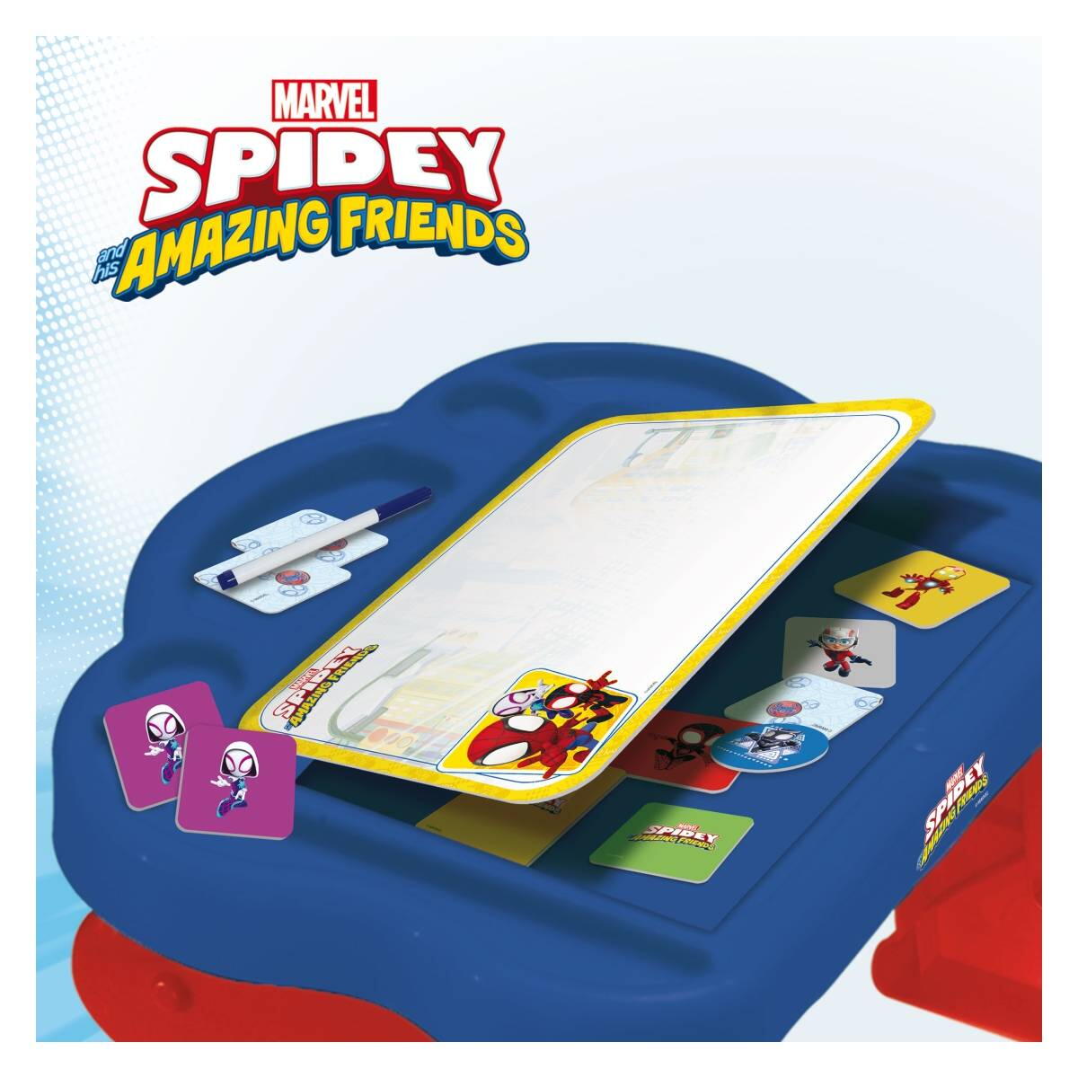 o parte a masutei este dedicata unei table de scris si sters, unde copiii pot utiliza markere speciale pentru a desena si scrie pe aceasta tablita, oferindu-le o modalitate creativa de exprimare