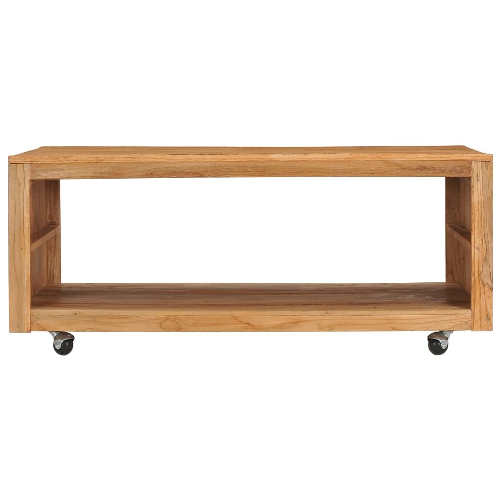 Această masă din lemn este construită din lemn masiv de tec, oferind un suport solid și durabil. Finisajul cu ulei natural asigură o suprafață netedă și este ușor de curățat și de întreținut. Partea de jos a mesei este echipată cu un raft pentru depozitarea unor obiecte diverse, iar roțile mobile ajută la transport și la deplasarea oriunde este nevoie.