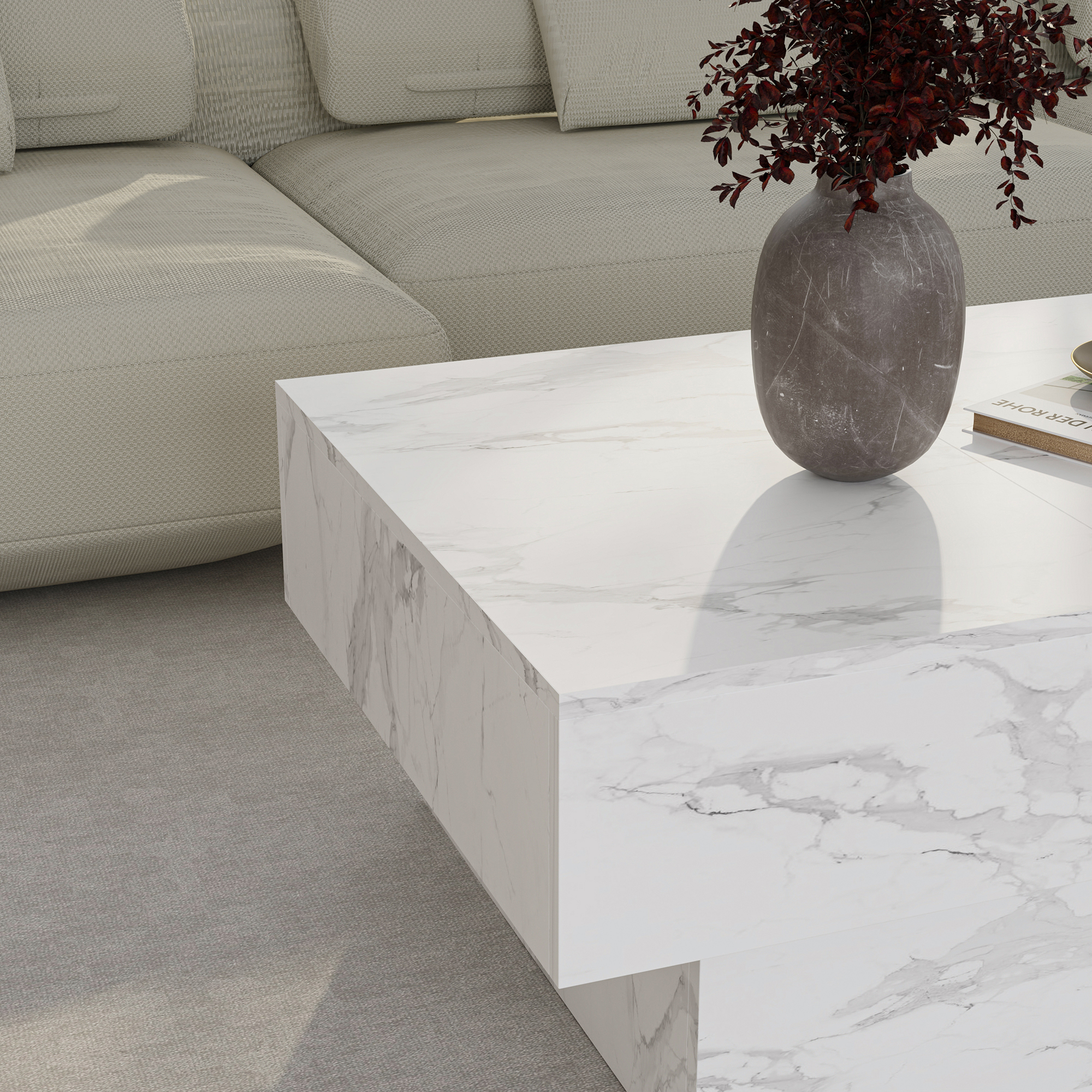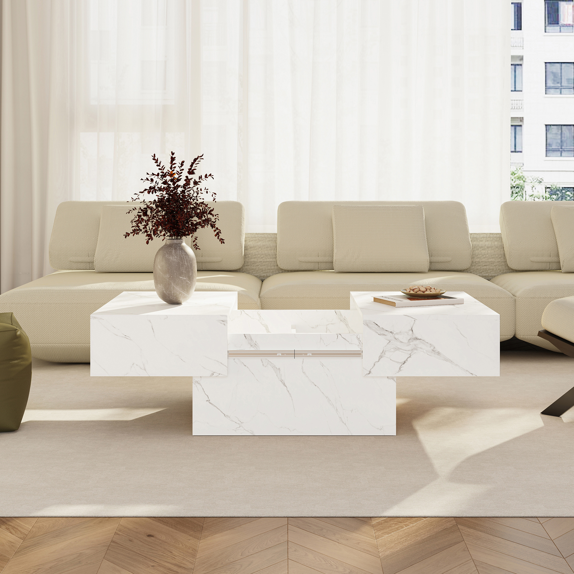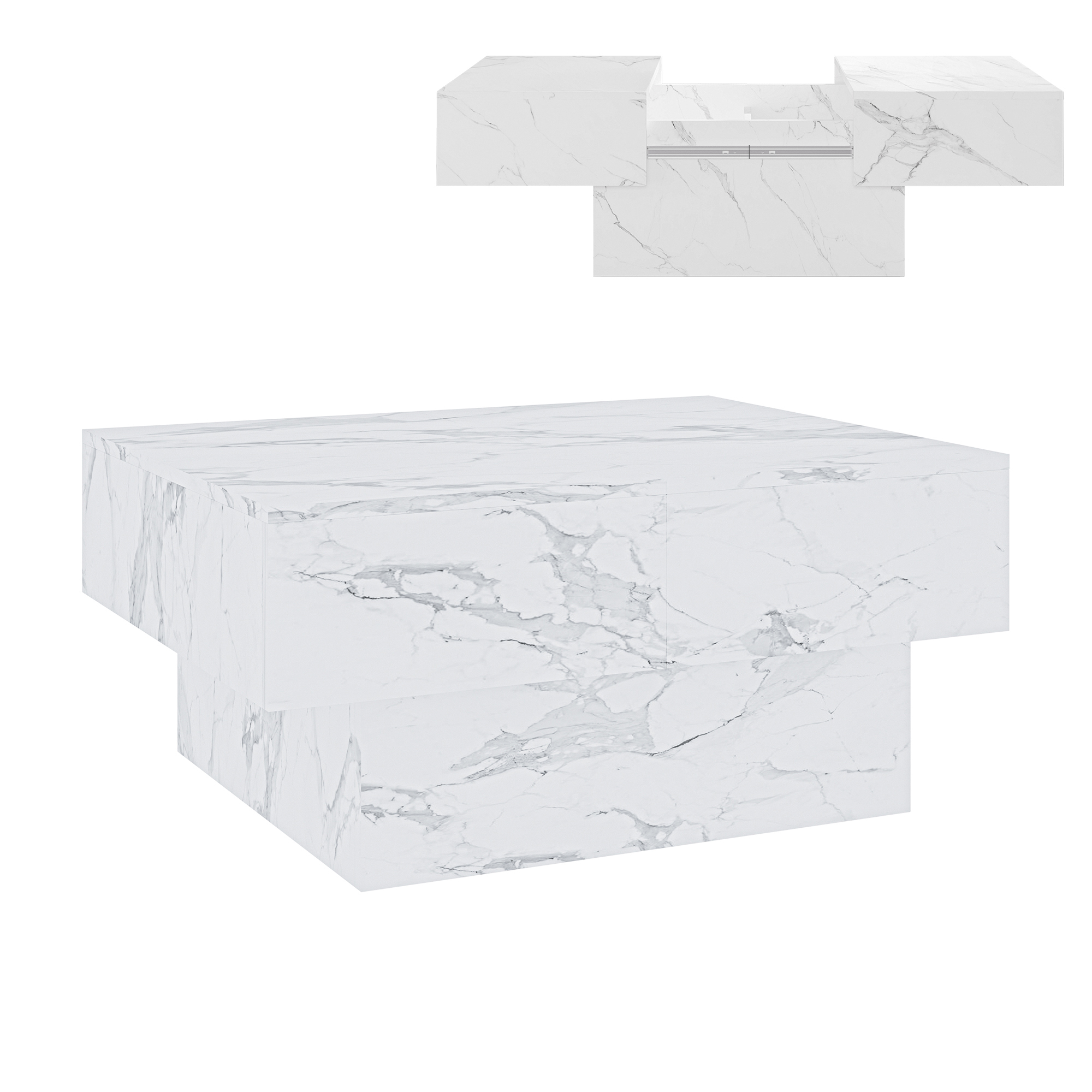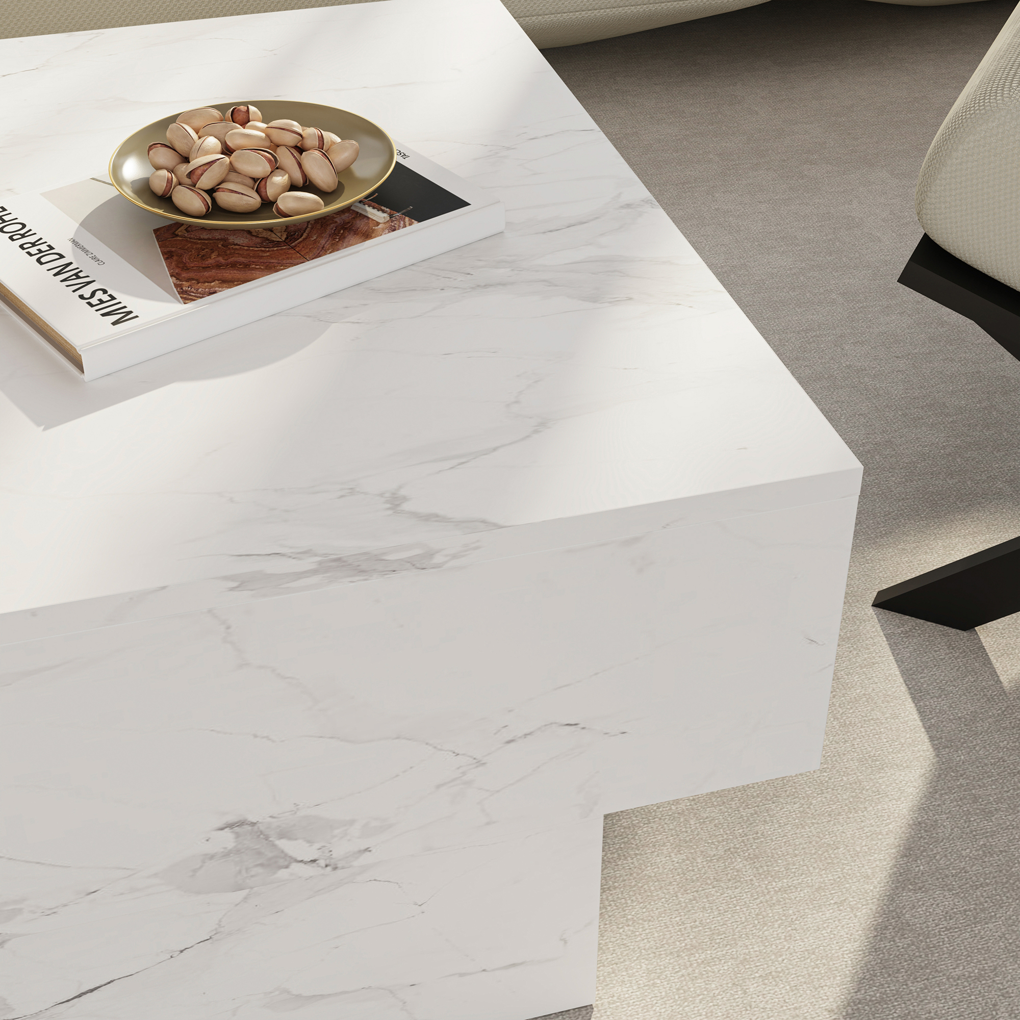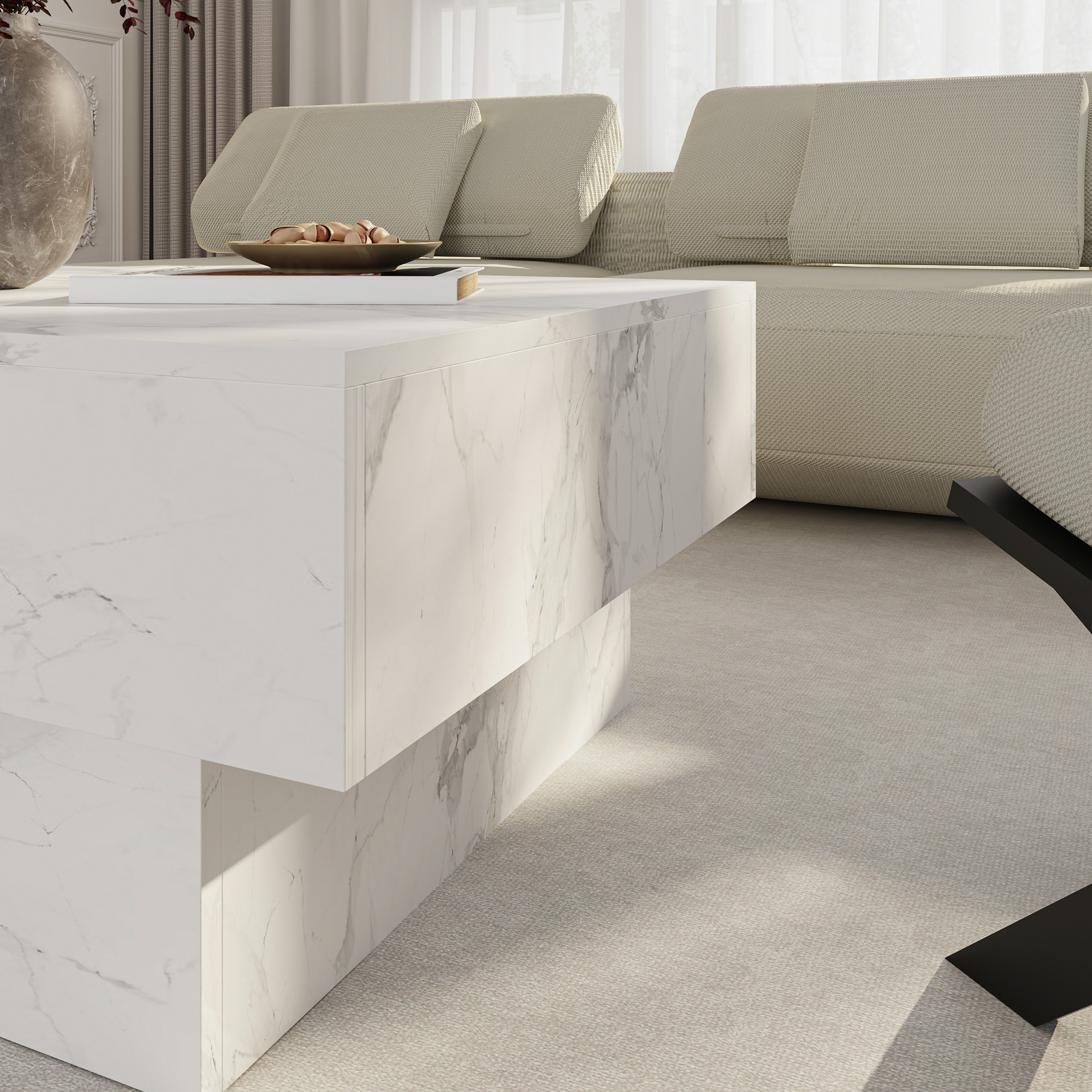Măsuța de cafea extensibilă Lens aduce un plus de rafinament în orice living, datorită designului modern și finisajului elegant în alb cu aspect de marmură. Este alegerea potrivită dacă îți dorești o măsuță de cafea pentru living care să combine stilul contemporan cu funcționalitatea de zi cu zi.