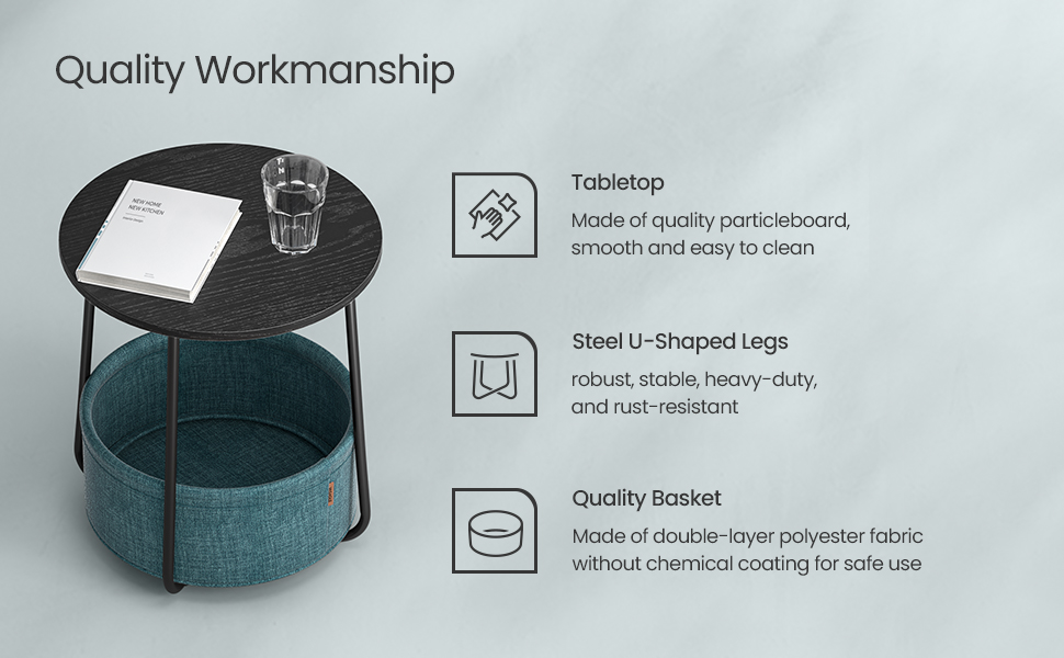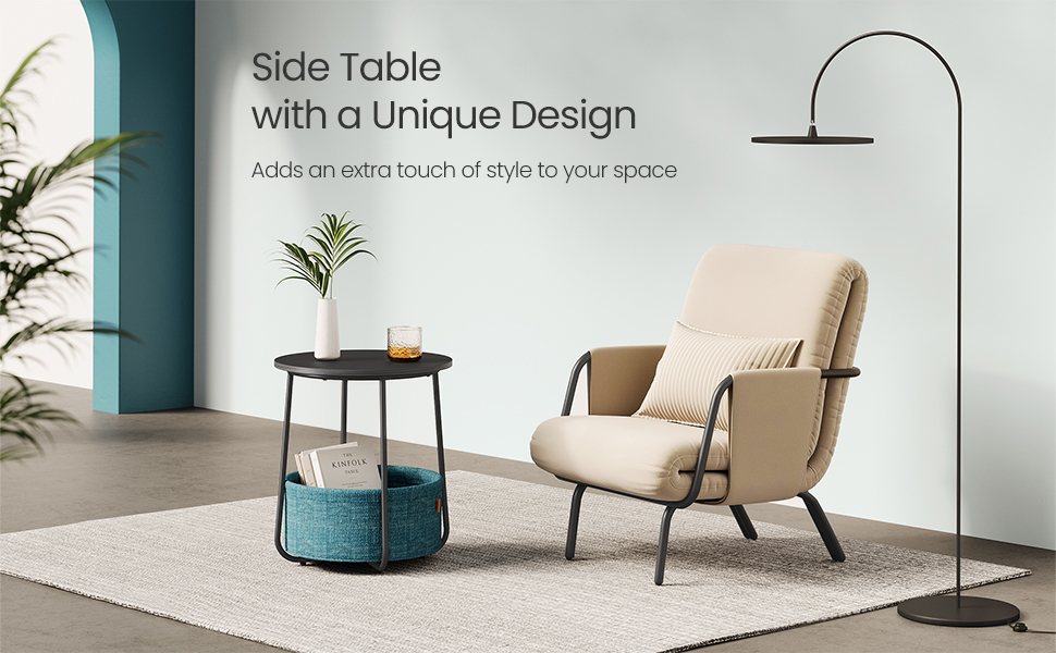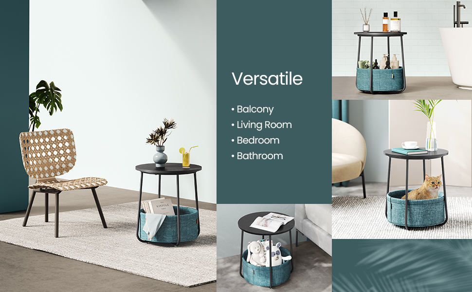 Alege o măsuță de cafea rotundă practică și elegantă, perfectă pentru amenajările moderne. Acest model Vasagle combină un blat compact, un cadru metalic stabil și un coș textil pentru depozitare, fiind ideal atât pentru living, cât și pentru dormitor. Designul în nuanțe de negru cu aspect de lemn și turcoaz închis adaugă un accent decorativ plăcut, fără să încarce spațiul.