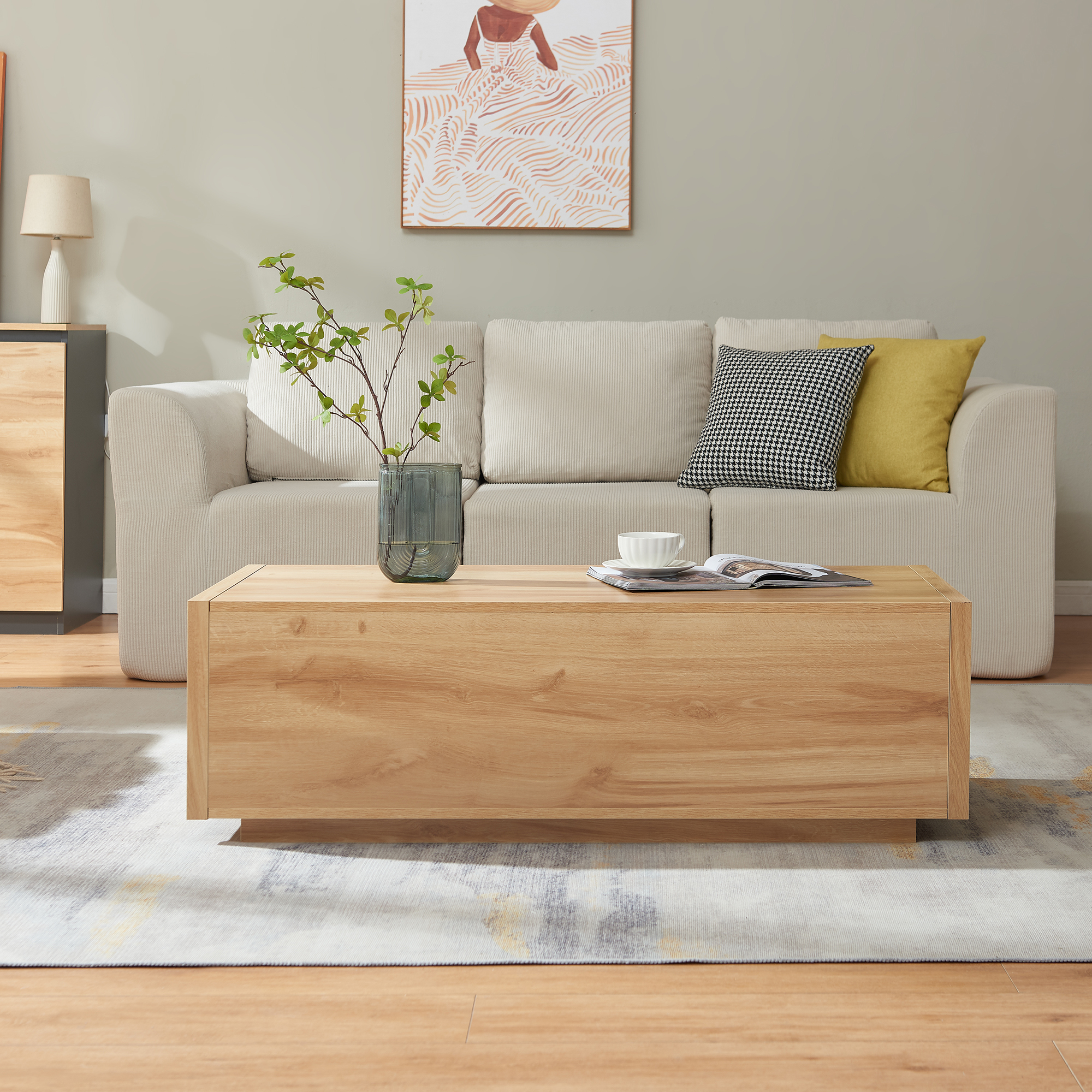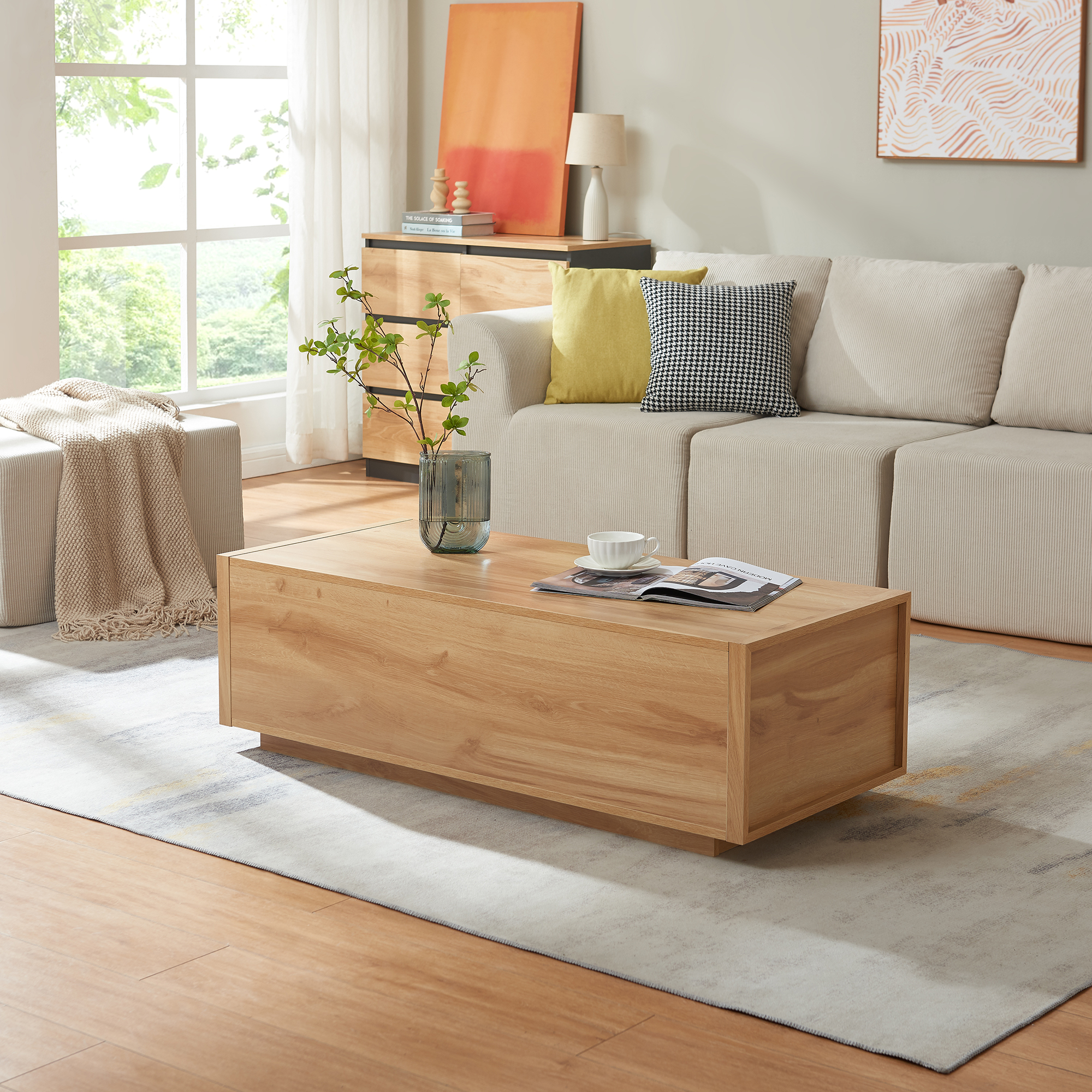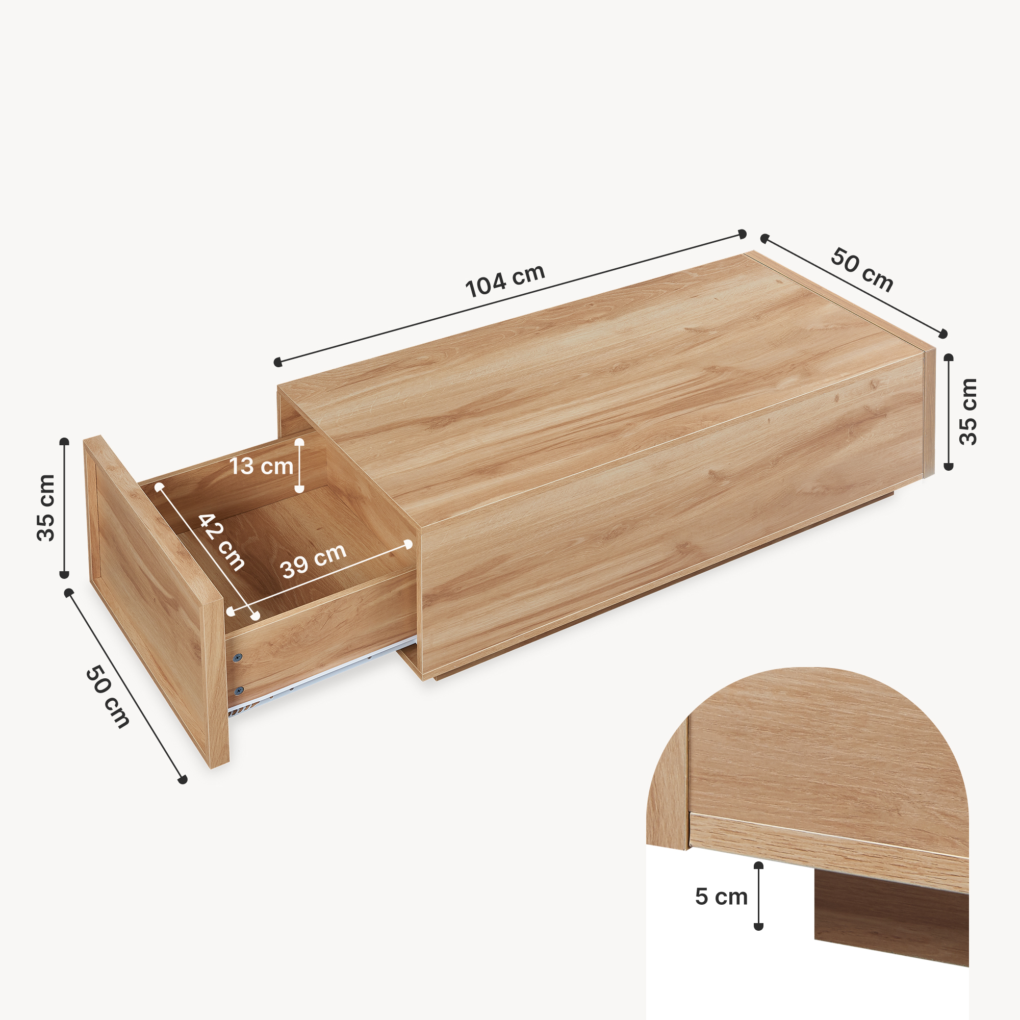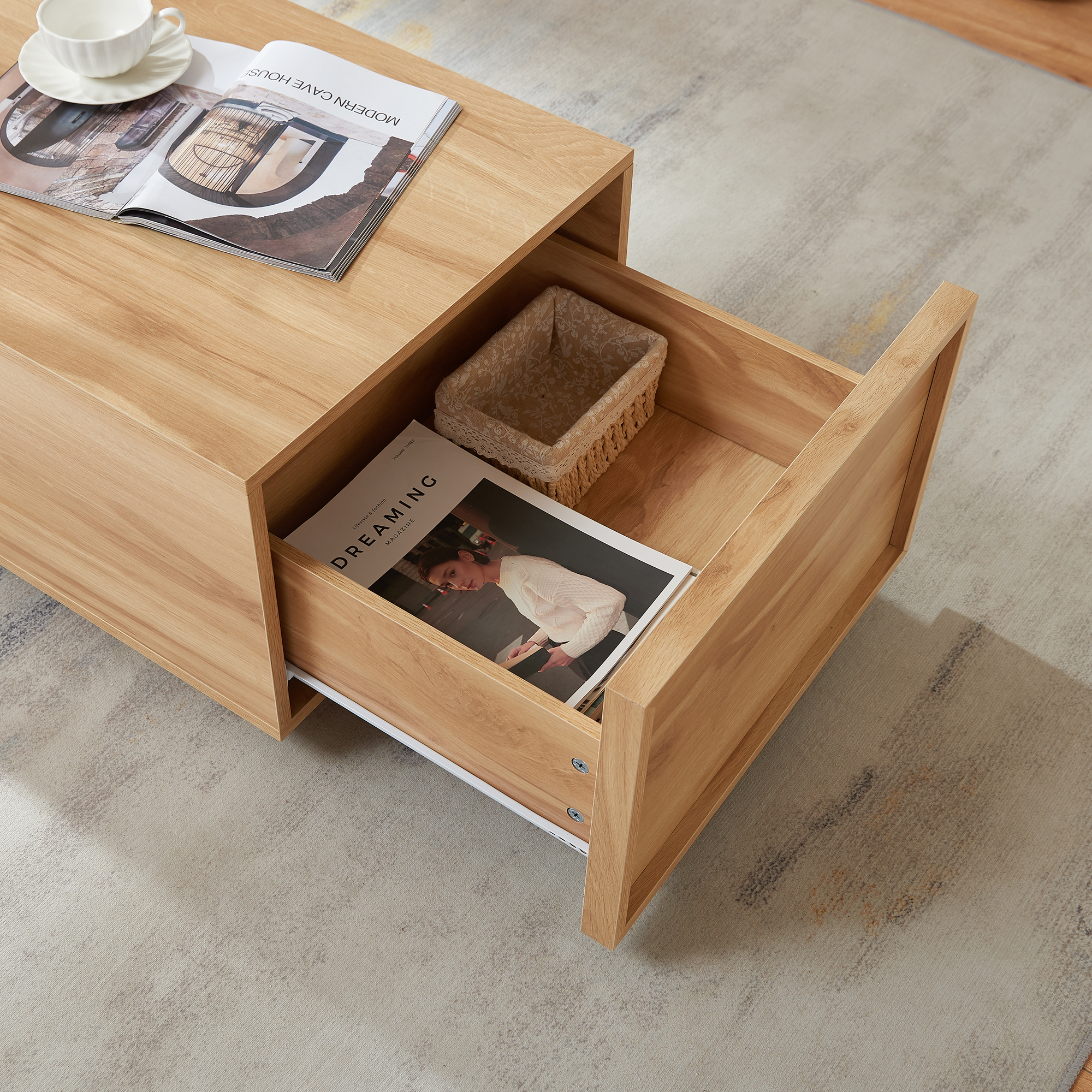 Blatul generos oferă suficient spațiu pentru cărți, reviste, telecomenzi, gustări sau băuturi, astfel încât să ai totul la îndemână în zona de relaxare. În plus, această măsuță de cafea cu sertare este prevăzută cu câte un sertar pe fiecare parte, ideale pentru depozitarea discretă a obiectelor de zi cu zi.