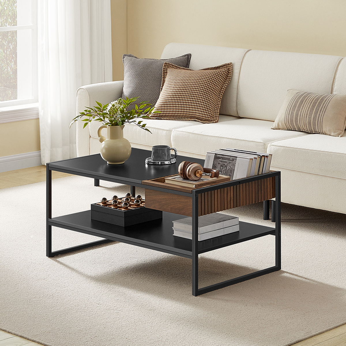 Prin combinația dintre sertar de depozitare, raft inferior și construcție rezistentă, această măsuță de cafea neagră este potrivită atât pentru relaxare, cât și pentru organizarea eficientă a livingului. O poți folosi pentru telecomenzi, cărți, obiecte decorative sau accesorii pe care vrei să le ai aproape, fără a încărca vizual încăperea.