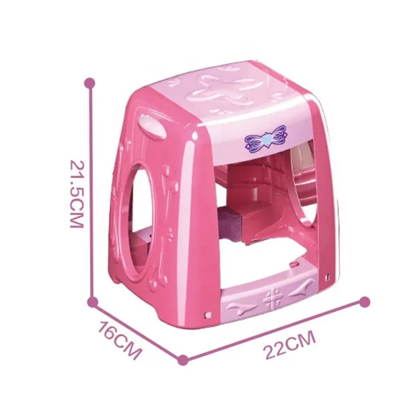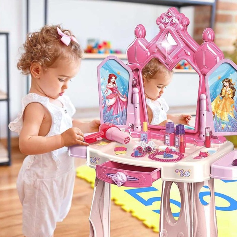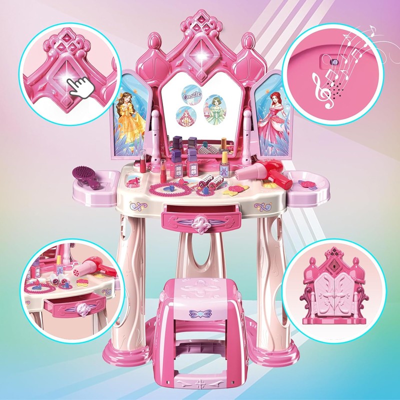 Transformă joaca într-un mic salon de frumusețe cu această măsuță de machiaj pentru fetițe, în nuanțe de roz, cu oglindă, lumini LED și muzică. Setul este perfect pentru jocuri de rol, ajutând copilul să își dezvolte imaginația, creativitatea și coordonarea, într-un mod sigur și distractiv.