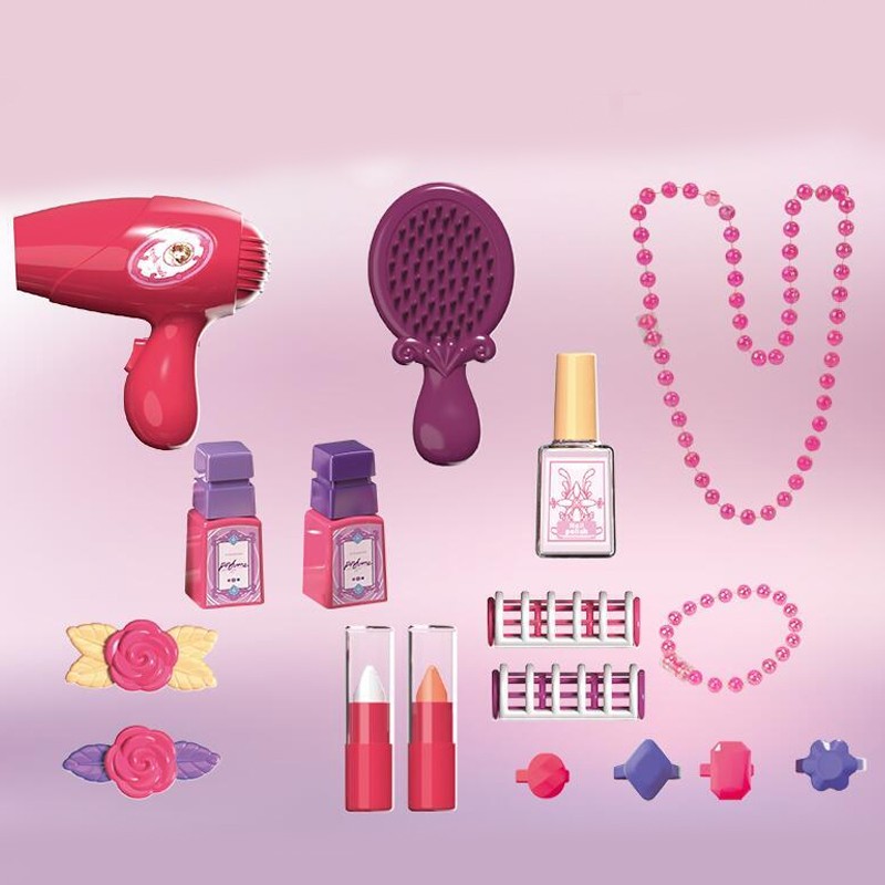 Setul include accesorii (în funcție de lot): rujuri de jucărie, lacuri de unghii de jucărie, perie de păr, uscător de păr, brățări, inele, agrafe, luciu de buze, bigudiuri și autocolante.