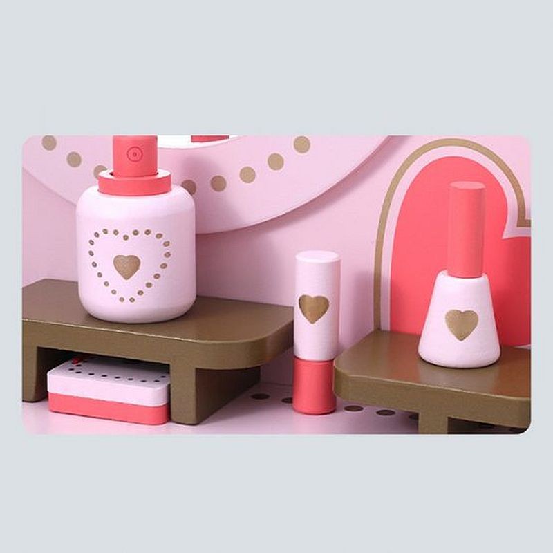 Transformă joaca într-un moment special cu această măsuță de toaletă pentru fetițe, un set adorabil în nuanțe de roz, cu oglindă, scăunel și accesorii. Designul clasic, cu inimioare decorative, o face rapid piesa preferată din cameră și îi ajută pe cei mici să exerseze joaca de rol și organizarea.