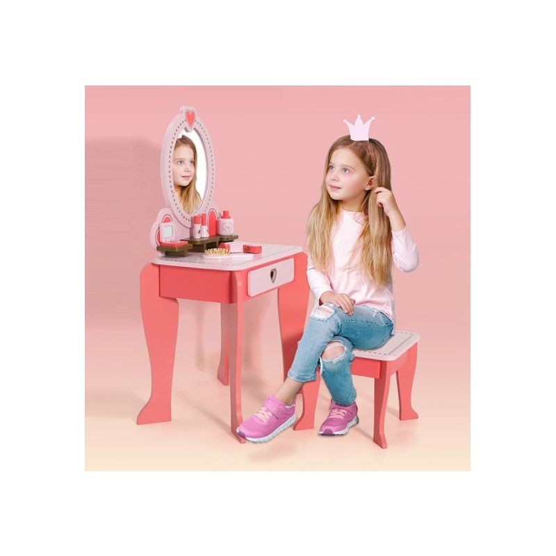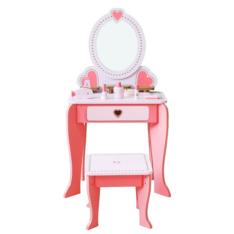 Măsuță de toaletă din lemn pentru fetițe cu oglindă, scaun și accesorii roz