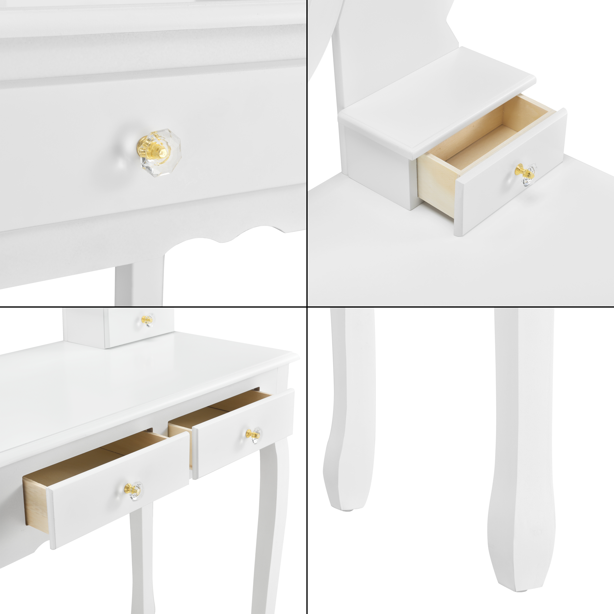 Prevăzută cu oglindă înclinabilă, această masă de machiaj vă ajută să obțineți un unghi confortabil în timpul rutinei zilnice. Cele 4 sertare și suprafețele laterale oferă loc suficient pentru produse cosmetice, parfumuri, bijuterii sau alte obiecte esențiale, iar taburetul cu șezut moale asigură un plus de confort.