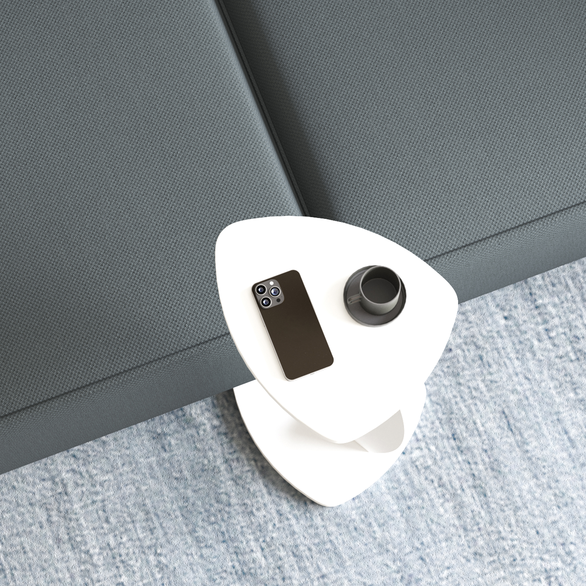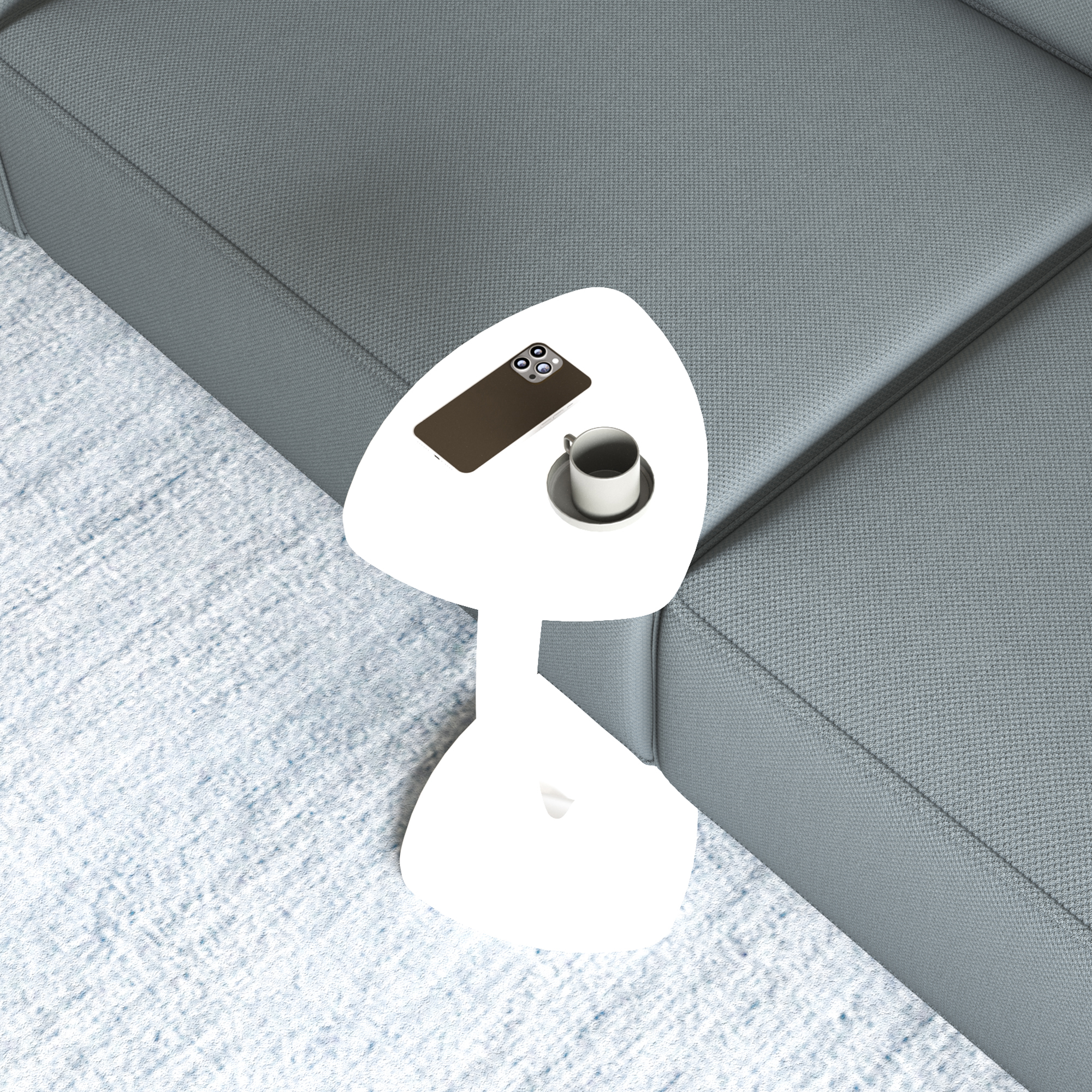 Designul său inteligent în formă de C o face foarte comodă pentru utilizarea lângă canapea sau fotoliu, oferind suport la îndemână pentru cafea, gustări, telefon, telecomandă sau cartea preferată. Din imagine, produsul se remarcă printr-o siluetă modernă și aerisită, ideală pentru interioare contemporane.