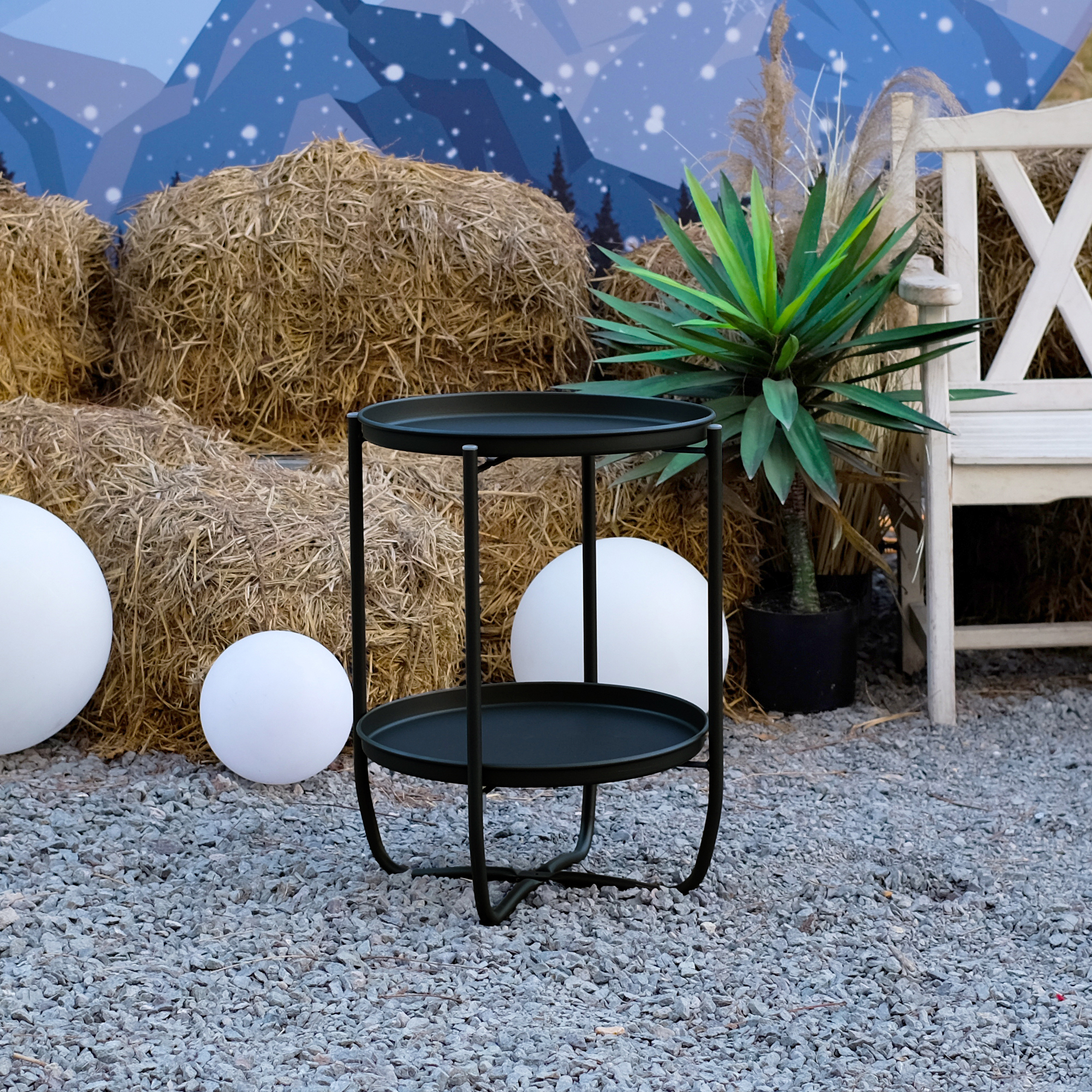 Folosește această măsuță laterală neagră lângă un fotoliu de grădină, pe terasă pentru servirea cafelei sau în living ca suport pentru decorațiuni și accesorii. Dimensiunea compactă o face ușor de amplasat chiar și în spații mai mici.