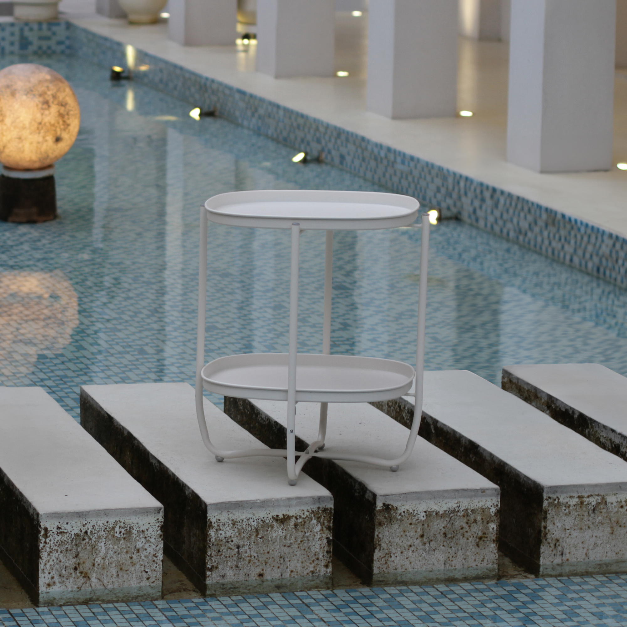 Poate fi folosită ca măsuță laterală albă lângă fotoliu, canapea sau șezlong, pentru servirea cafelei, băuturilor răcoritoare ori gustărilor. În sezonul cald este perfectă pentru amenajarea unui colț confortabil pe terasă sau lângă piscină, iar în interior poate deveni un accent decorativ discret și util.