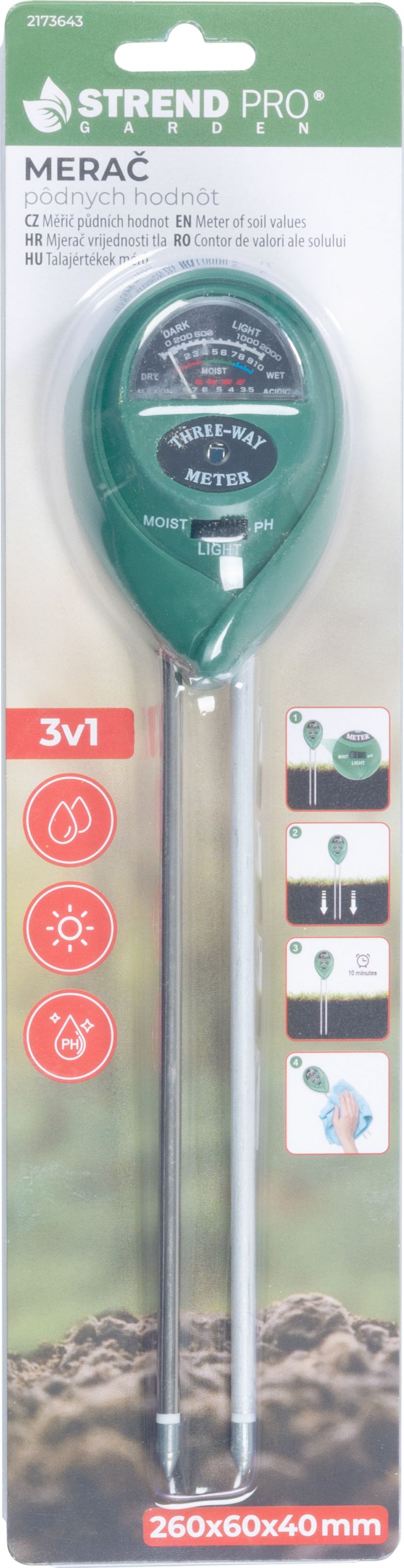 Merač Strend Pro 3v1, pôdnych vlastností, PH, vlhkosť, intenzita svetla, 26x6x4 mm, tester