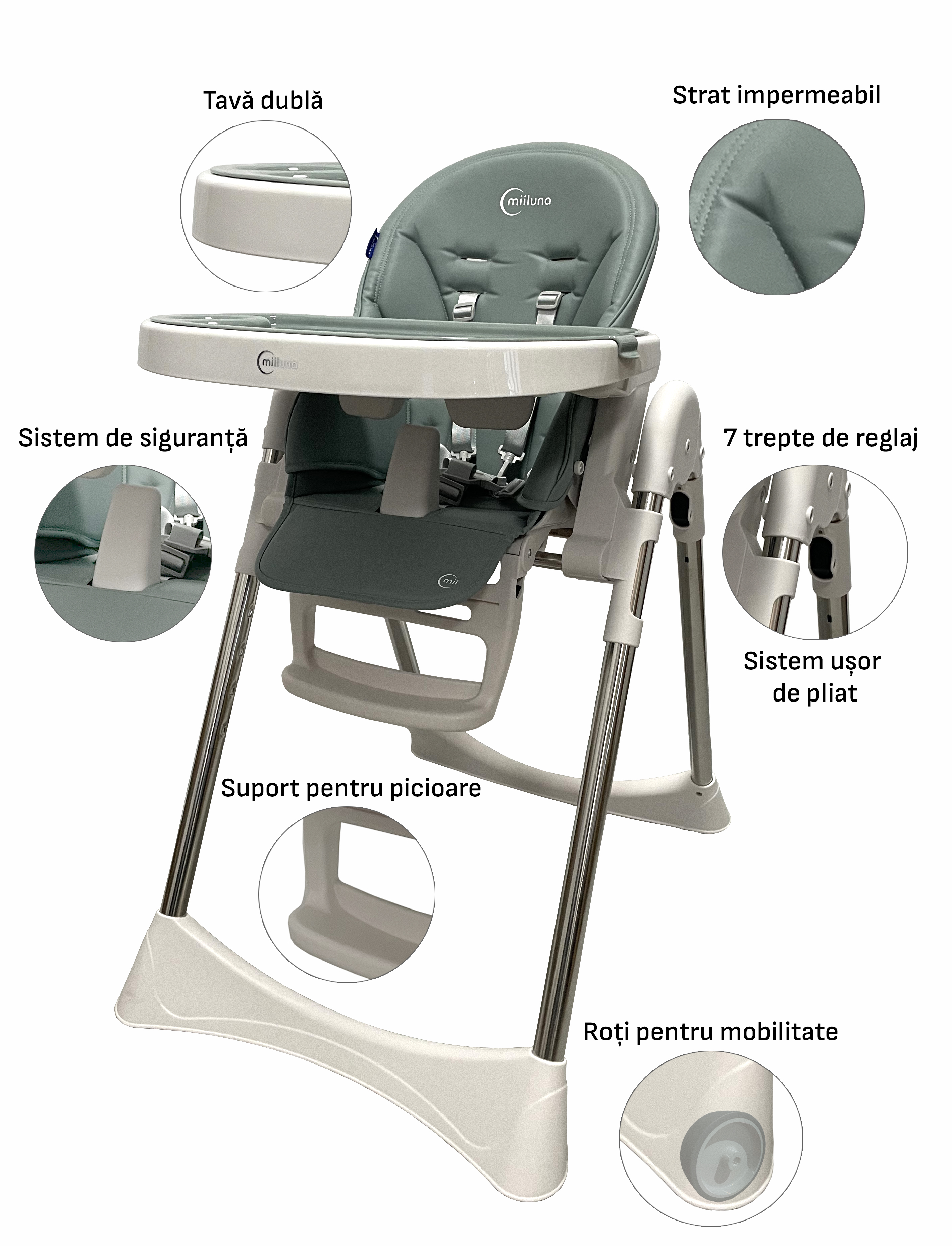 Miiluna Andromeda Taupe locul sigur si confortabil unde fiecare moment devine special Imaginati-va cum micutul vostru zambeste in timp ce il asezati in scaun relaxat, confortabil, protejat. Miiluna Andromeda Taupe nu este doar un scaun de masa, ci locul unde primele gusturi, primele rasete si primele descoperiri devin memorii de neuitat. Spatar reglabil pana la 145° Fie ca micutul vrea sa stea drept la masa sau sa se relaxeze dupa o gustare, spatarul reglabil in 3 pozitii ii ofera sustinere perfecta. Este ca un mic brat care il tine confortabil, protejat si fericit, fie ca se joaca sau doarme o clipa. Suport de picioare ajustabil in 3 pozitii Copiii cresc rapid, iar Miiluna Andromeda Taupe creste impreuna cu el. Suportul de picioare il ajuta sa stea corect si relaxat, sprijinindu-i micile membre intr-un mod natural si ergonomic. Reglare inaltime pe 7 pozitii Indiferent daca este un mic explorator sau abia incepe sa invete sa stea la masa, scaunul se ajusteaza usor pentru a fi la inaltimea perfecta. Tu vei avea tot timpul acces la el fara sa te apleci prea mult, iar el se simte implicat si in siguranta. Husa din PU ecologic, usor de curatat Zambete, gusturi noi, pete&hellip toate fac parte din copilarie! Dar curatarea nu trebuie sa fie o povara. Materialul ecologic al husei se curata rapid si usor, pastrand scaunul proaspat si igienic pentru fiecare moment petrecut impreuna. Masa principala si tavita secundara Fiecare masa sau moment de joaca poate fi adaptat instant. Tavita secundara se inlocuieste rapid, astfel incat sa treci usor de la hranire la joc. Asa, copilul tau exploreaza, gusta si invata fara intreruperi, iar tu te bucuri de fiecare zambet. Rotite pentru transport facil Vrei sa muti scaunul din bucatarie in living sau in camera de joaca? Cu rotitele integrate, mutarea este rapida si fara efort, iar copilul ramane mereu in centrul atentiei tale. Pliabil si usor de depozitat Cand spatiul e limitat, fiecare centimetru conteaza. Miiluna Andromeda Taupe se pliaza simplu si ocupa foarte putin loc, astfel incat sa ai mai mult spatiu pentru joaca, pentru tine sau pentru momentele in care vrei sa pastrezi ordinea. Culori moderne si elegante Pe langa functionalitate, scaunul aduce un strop de stil in casa ta. Culorile sale moderne se potrivesc armonios in orice interior, integrandu-se natural si aducand o nota de prospetime si veselie. Stabilitate si siguranta Cu sistemul de amortizare profesionist si centura de siguranta in 5 puncte, copilul tau este protejat in orice moment imprevizibil. Tu te bucuri linistita, iar el se simte liber sa exploreze, sa invete si sa rada. Caracteristici tehnice complete Spatar reglabil pana la 145° Suport de picioare reglabil in 3 pozitii Reglare inaltime pe 7 pozitii Husa din PU ecologic, usor de curatat Masa principala si tavita secundara, cu inlocuire rapida Rotite pentru transport facil Pliabil si usor de depozitat Centura de siguranta in 5 puncte Sistem profesionist de amortizare pentru stabilitate Culori moderne si elegante, adaptabile oricarui interior Versatil se poate folosi ca scaun de masa, fotoliu, scaun de joaca sau masa de activitati Dimensiuni Depliat 82 cm (L) x 57cm (A) x 105 cm (I) Ambalat 82 cm (L) x 57cm (A) x 105 cm (I)