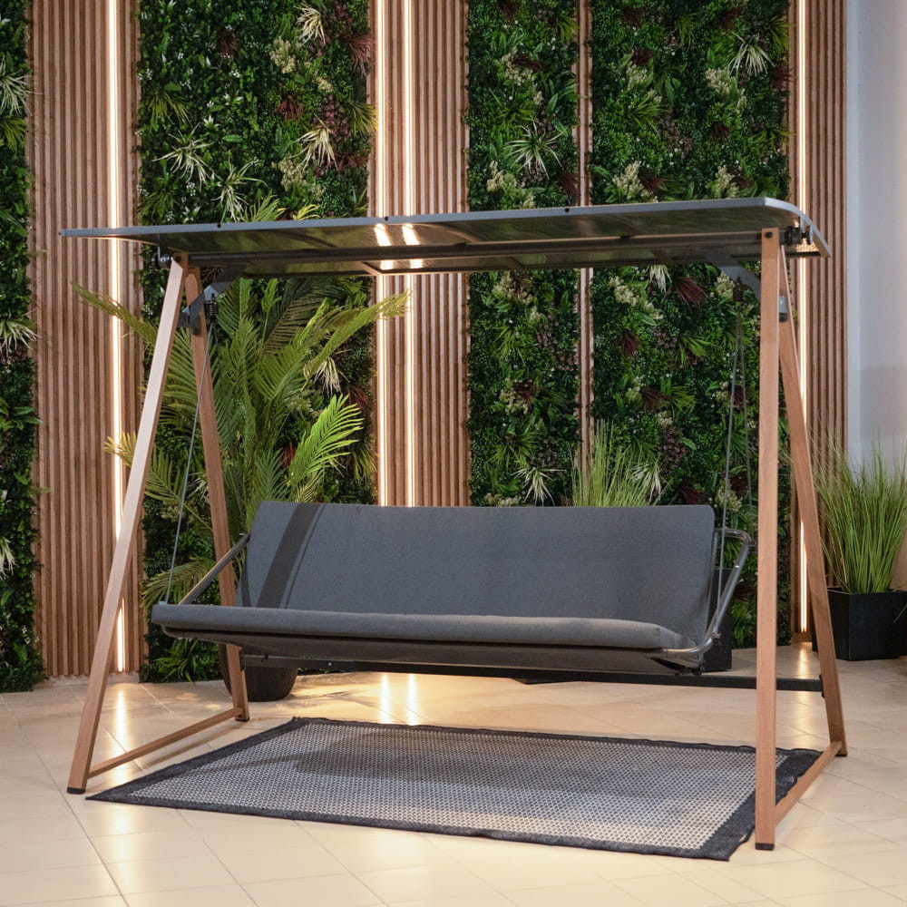 - Un balansoar de grădină pentru 3 persoane, cu design elegant, perfect pentru o grădină sau o terasă modernă
