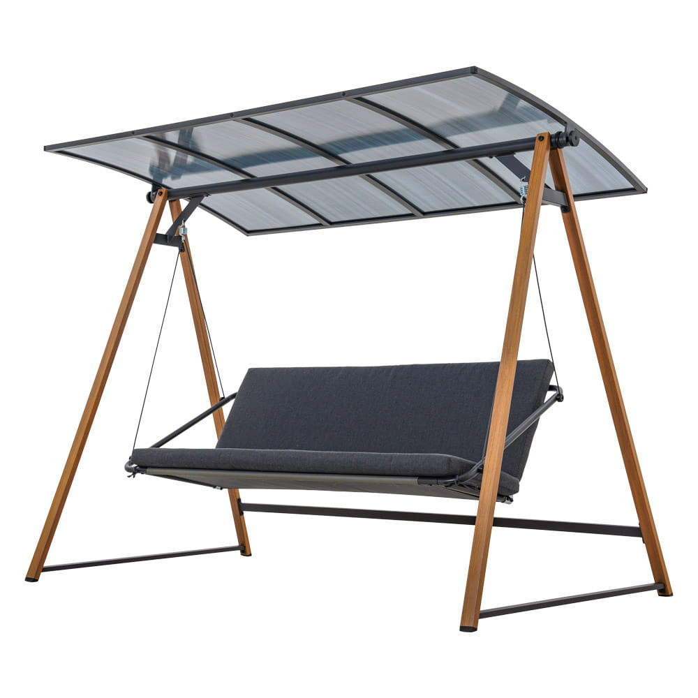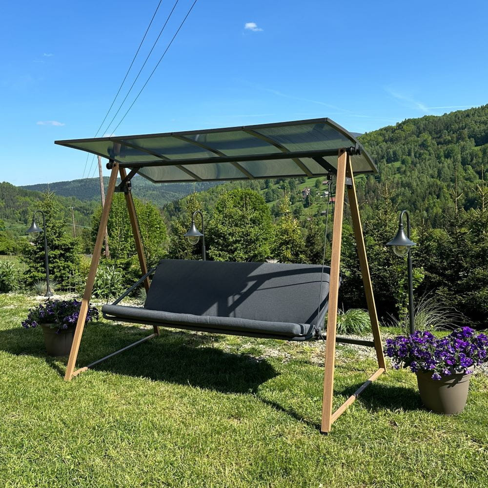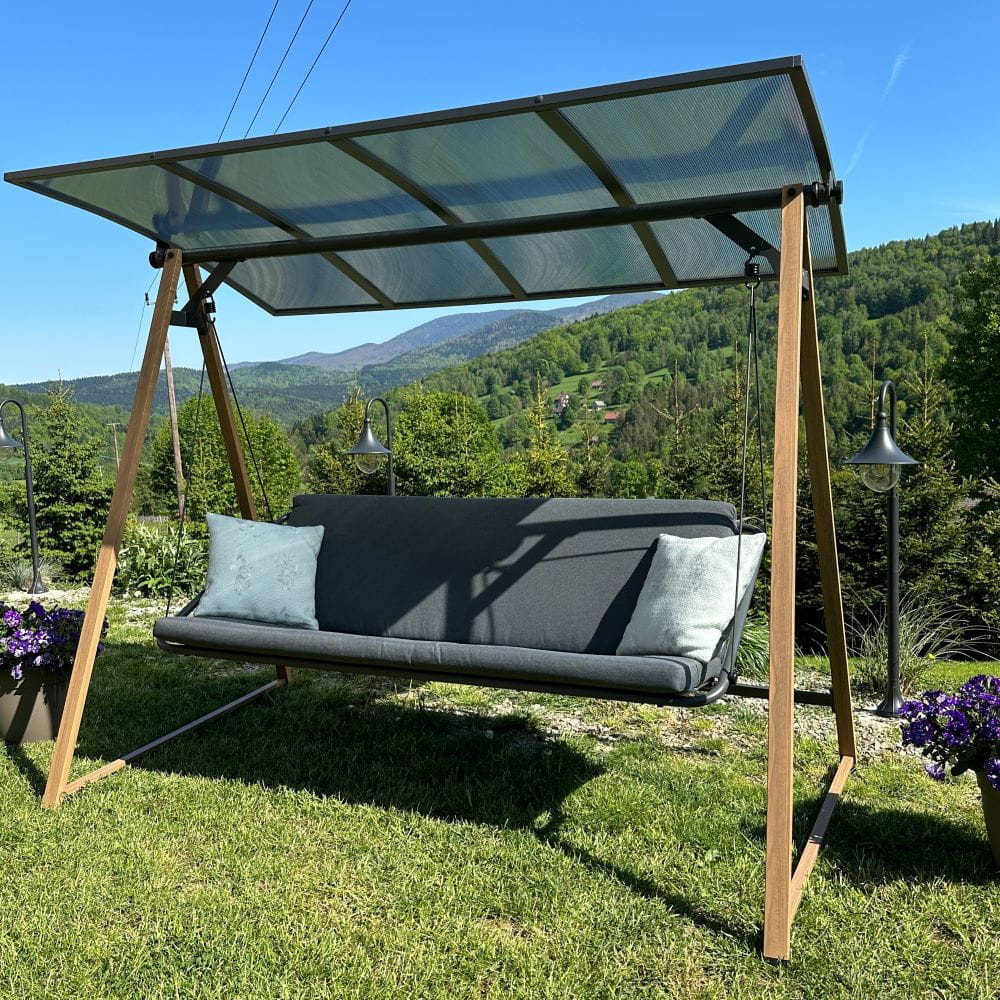 Leagănul de grădină din oțel vopsit în câmp electrostatic se remarcă prin durabilitatea sa - materialul său este rezistent la coroziune și la condițiile meteorologice schimbătoare, astfel încât mobilierul poate fi utilizat pentru o perioadă mai lungă de timp . Perna șezutului este fabricată din poliester, care are o absorbție redusă de apă și este ușor de întreținut. Un mare avantaj al balansoarului este acoperișul din policarbonat, care protejează eficient împotriva luminii solare excesive sau a ploii ușoare.
