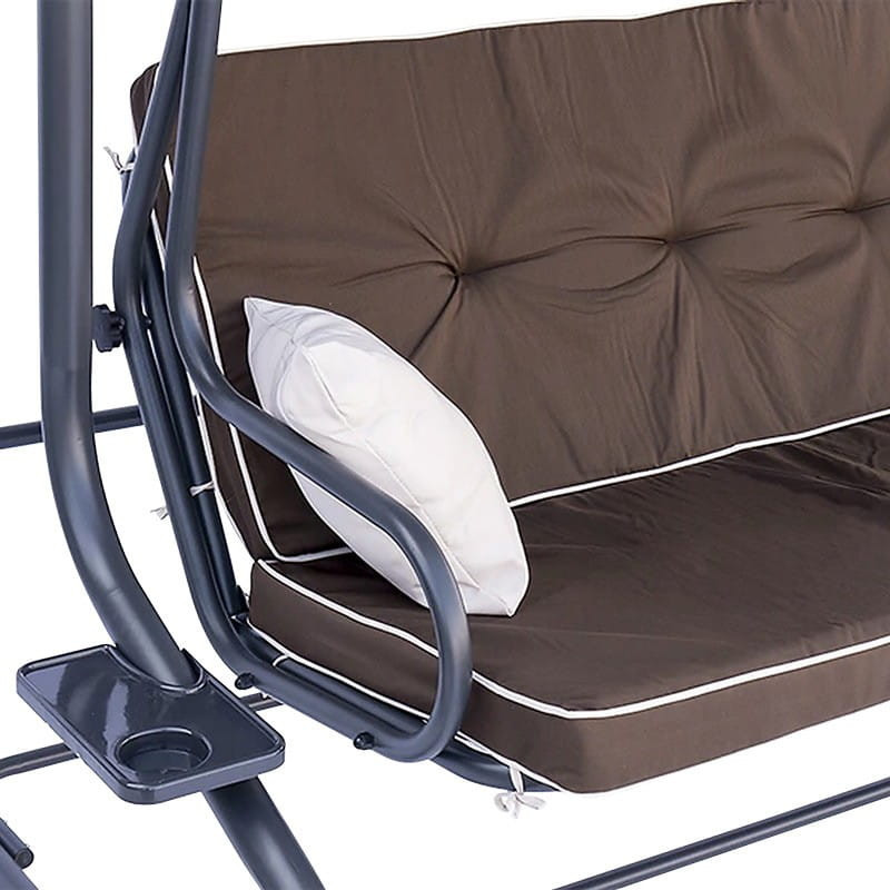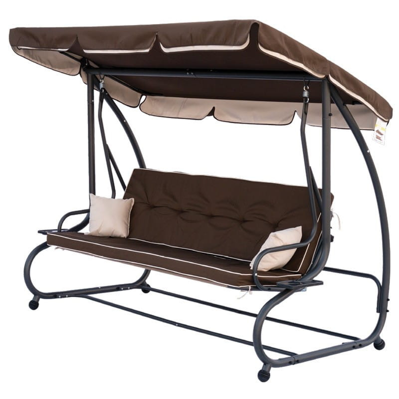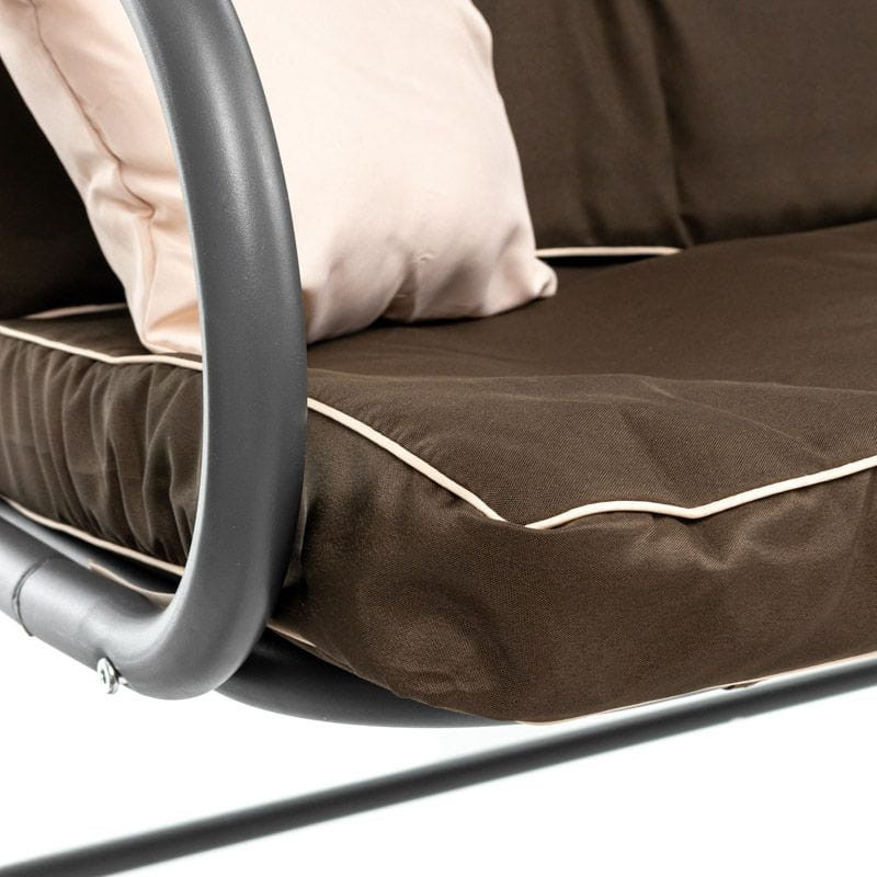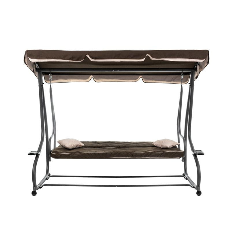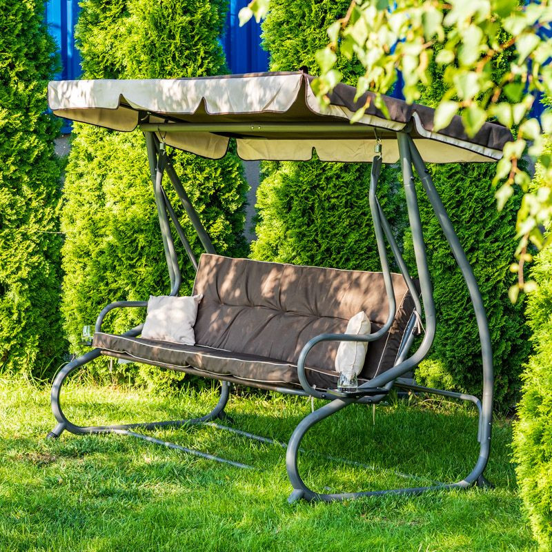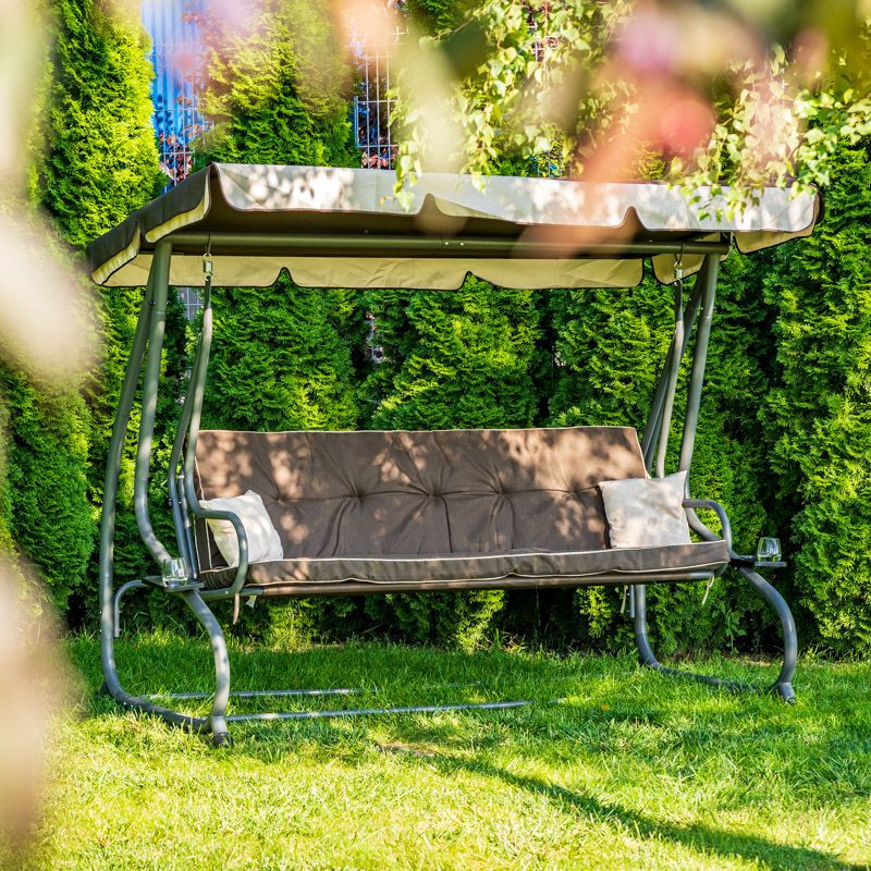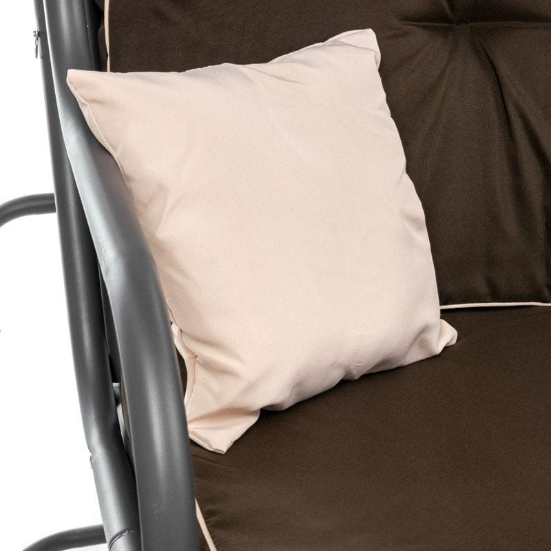 Leagănul de grădină are cotiere , ceea ce sporește semnificativ confortul șezutului. Setul include perne de șezut cu tetiere și perne decorative. Leagănul de grădină acoperit are rafturi pentru băuturi , perfecte pentru a vă relaxa împreună la aer curat.