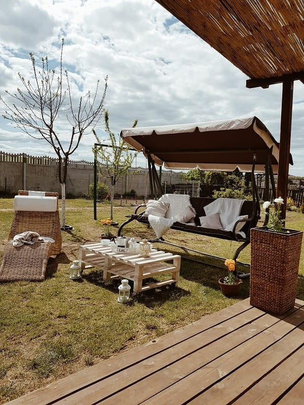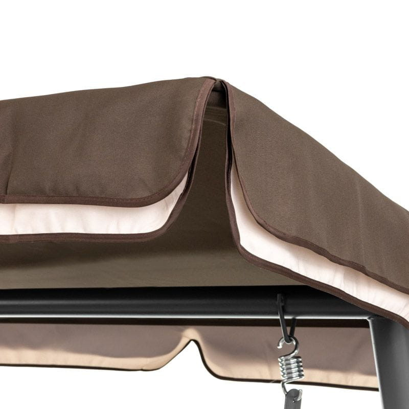Spătarul balansoarului de grădină poate fi rabatat în poziție culcat , permițându-vă să vă relaxați în orice poziție. Avantajul este acoperișul reglabil , care protejează împotriva luminii puternice a soarelui.