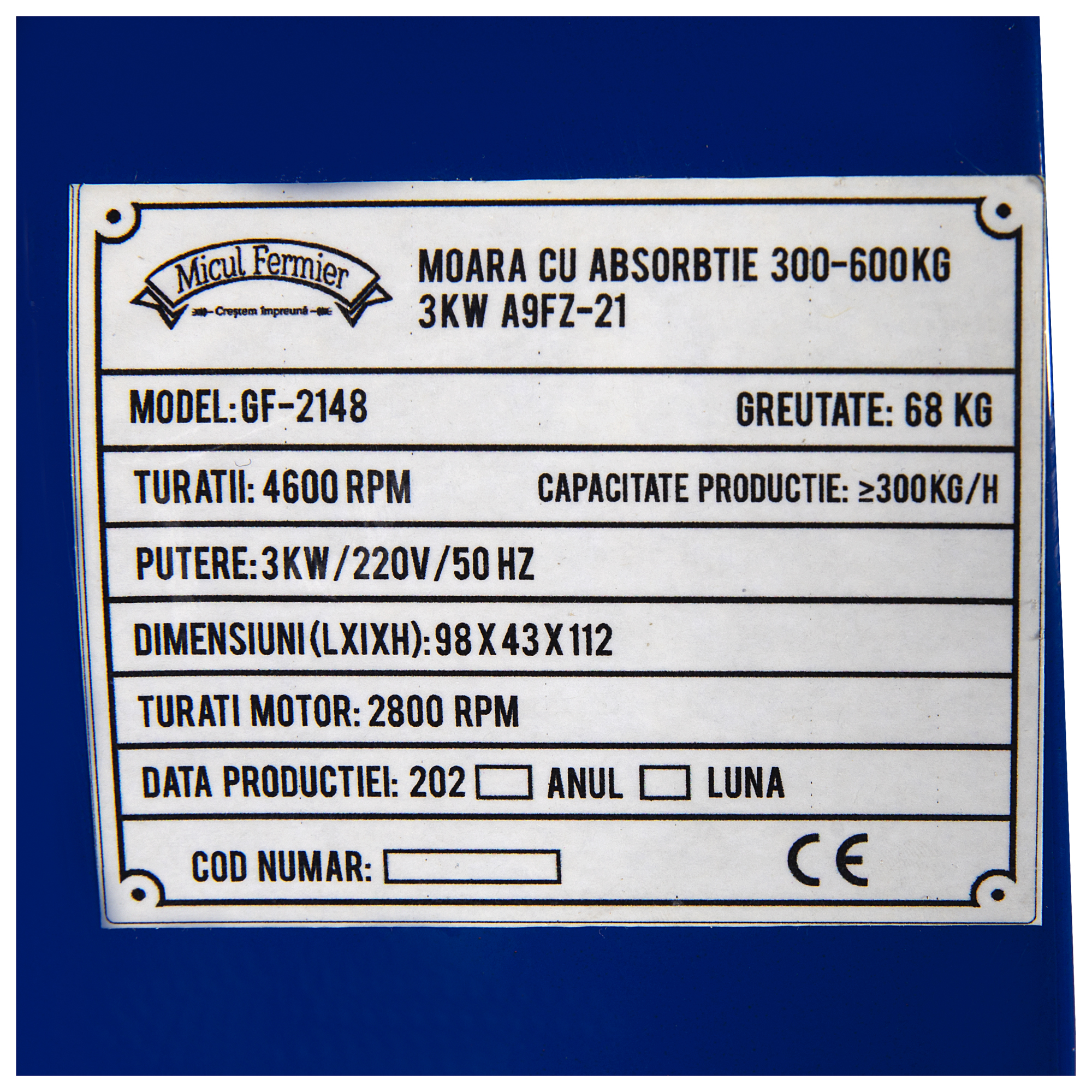 Specificatii Moara absortie 300-600kg 3KW A9FZ-21 FarmGarden