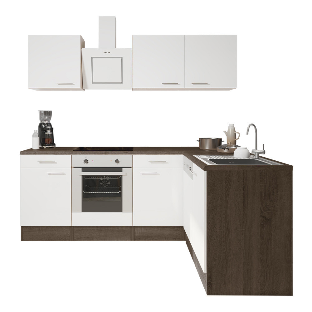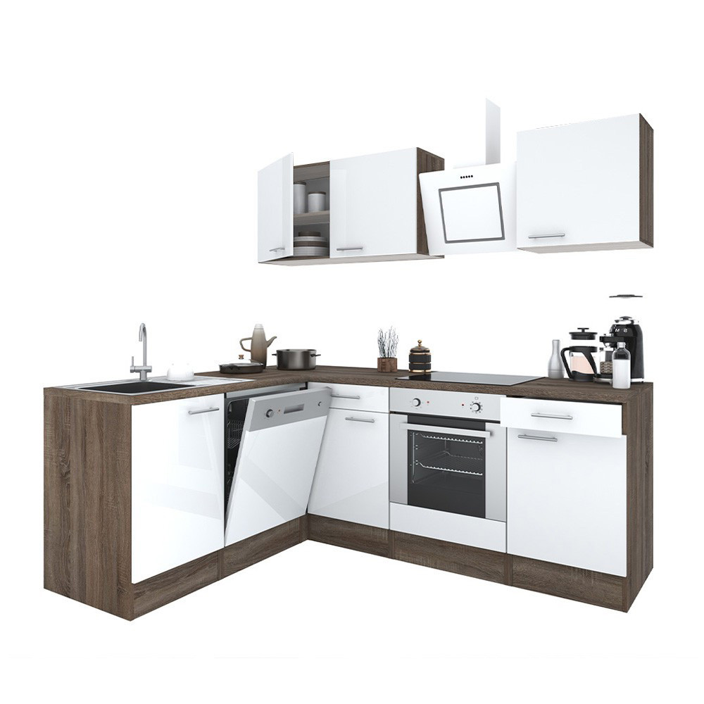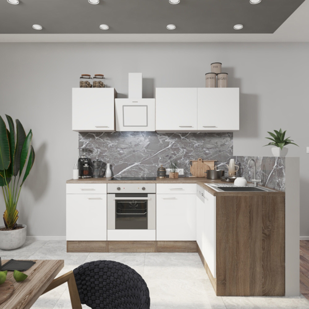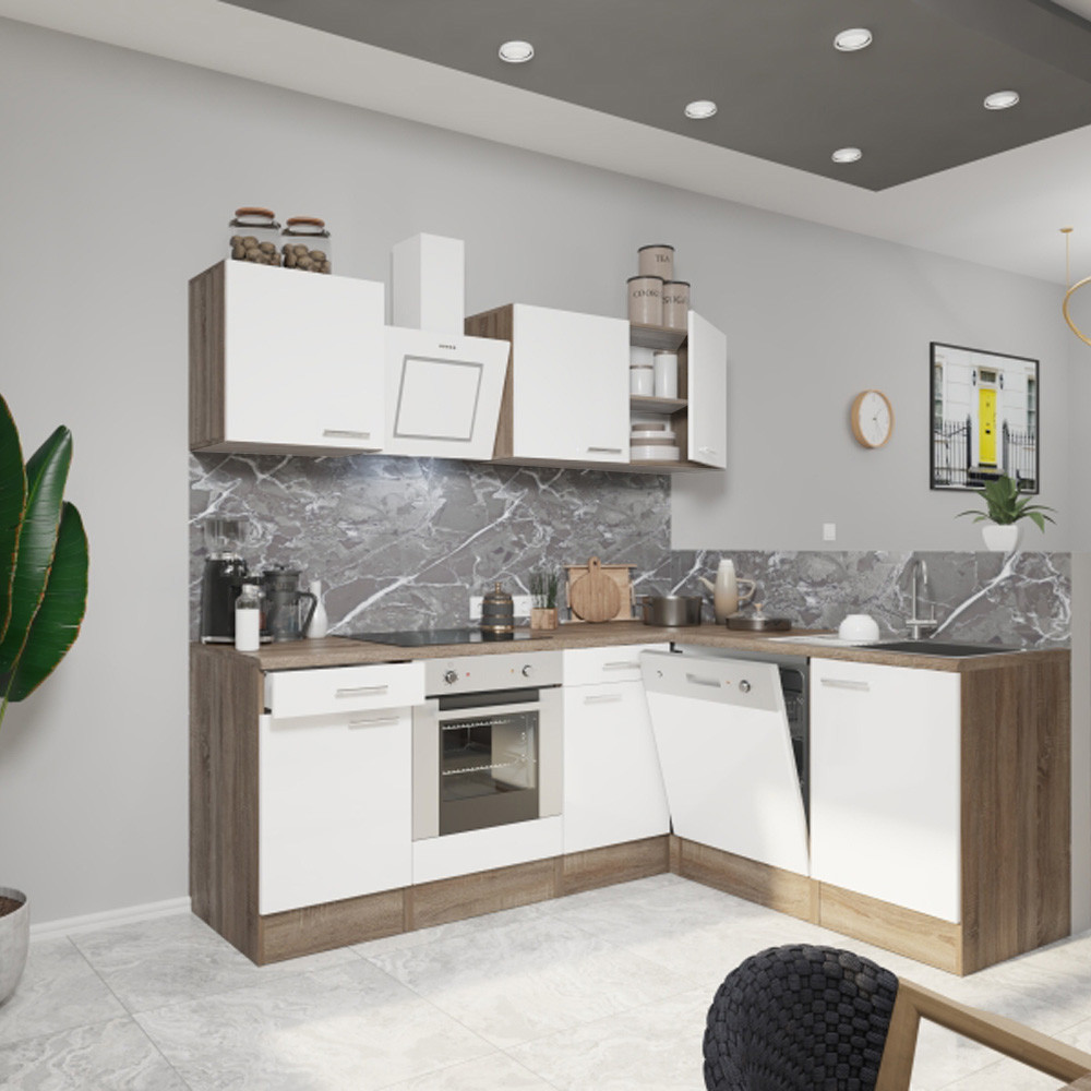 Mobilă bucătărie de colț Leziter Yorki 220 cm, stejar Yorki/alb satinat, cu corp cuptor