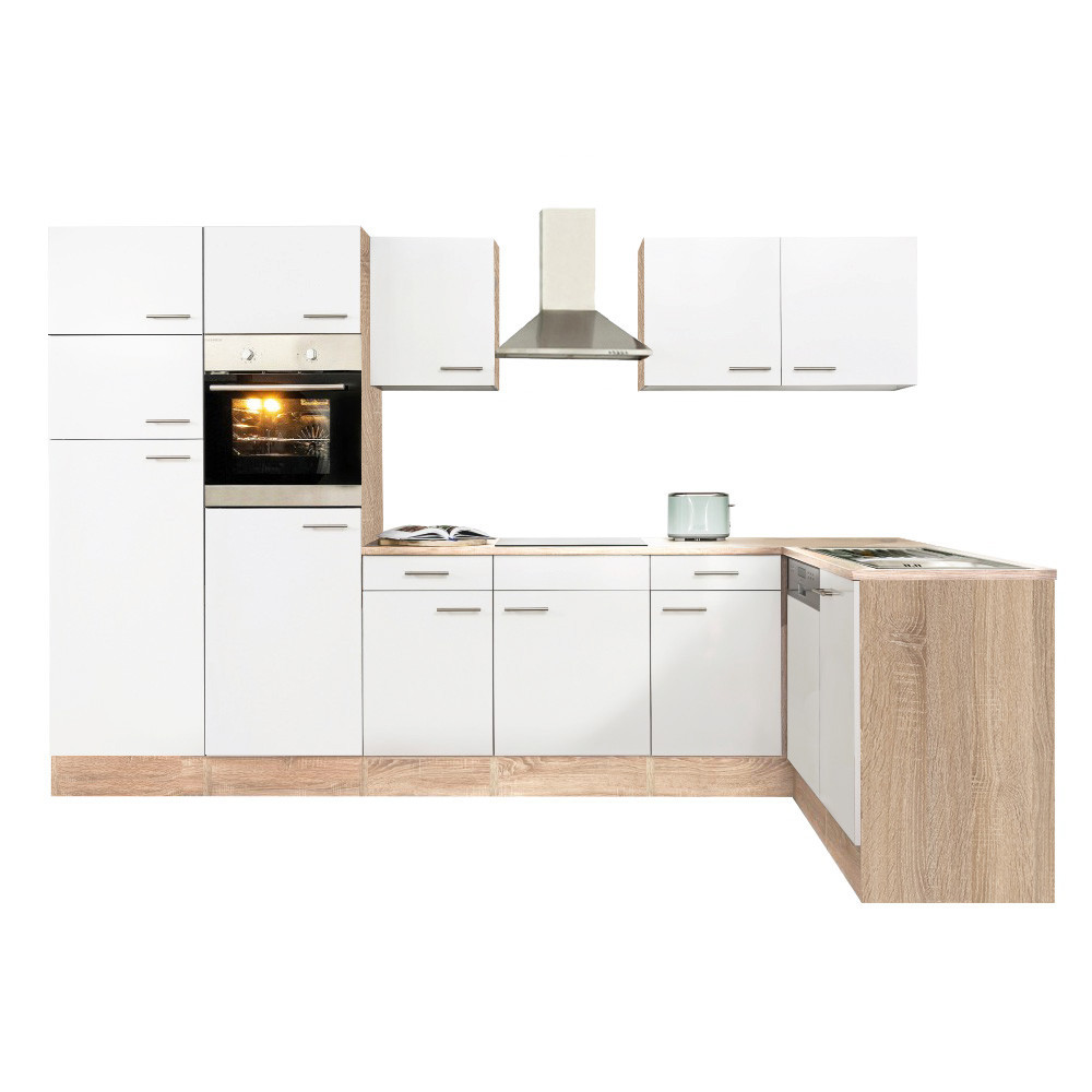 Transformă-ți bucătăria într-un spațiu modern și bine organizat cu mobila de bucătărie de colț Leziter Yorki, cu lungime totală de 340 cm. Combinația caldă de stejar Sonoma și fronturi alb satinat se potrivește ușor în locuințe din România, oferind un aspect luminos și un plus de funcționalitate.